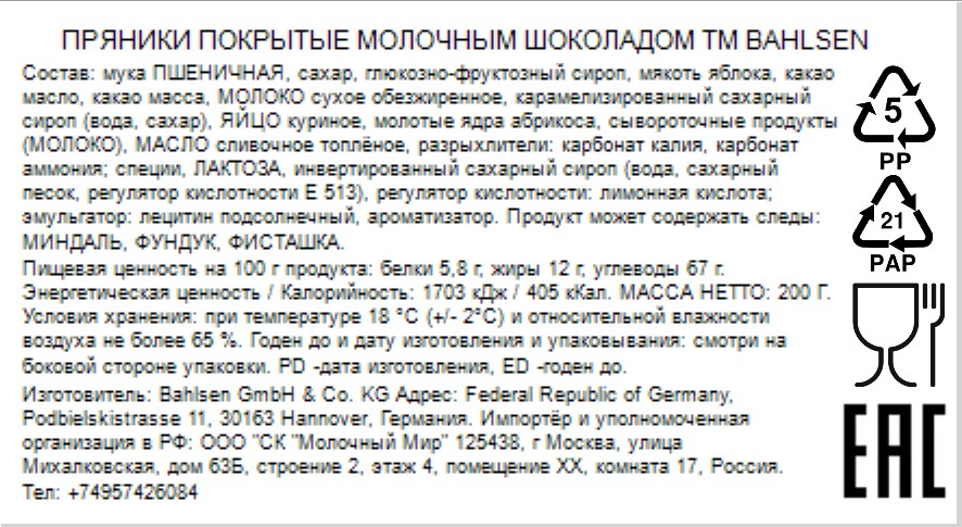 Пшеничная мука, сахар, глюкозно-фруктозный сироп, яблочный жом, какао-масло, какао-масса, сухое обезжиренное молоко, карамелизированный сахарный сироп, цельное куриное яйцо, молотые абрикосовые косточки, сывороточные продукты молоко, топленое сливочное масло, пальмовое масло, разрыхлители: карбонаты калия, карбонаты аммония; специи, лактоза, инвертный сахарный сироп, кислота: лимонная кислота; эмульгатор: лецитины; ароматизатор.