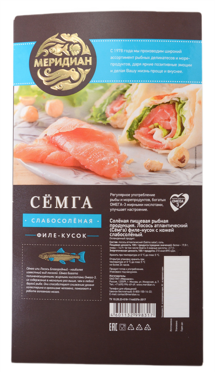 Семга кусок слабосоленая Меридиан, 200г – это вкусный деликатес, который станет украшением любого стола. Продается он в оригинальной картонной упаковке с привлекательным дизайном. Через небольшое прозрачное окошко можно визуально оценить качество продукта до покупки. Вся необходимая информация указана. В филе семги содержится большое количество витаминов и минеральных веществ, в нем присутствуют полиненасыщенные жирные кислоты Омега, необходимые для нормальной работы организма. В нем практически отсутствуют кости. Чаще всего этот деликатес подают соло, в составе рыбного ассорти или используют для приготовления бутербродов. Семгу можно добавить в уху, чтобы сделать ее более вкусной и наваристой. В некоторых салатах красное мясо является незаменимым ингредиентом.