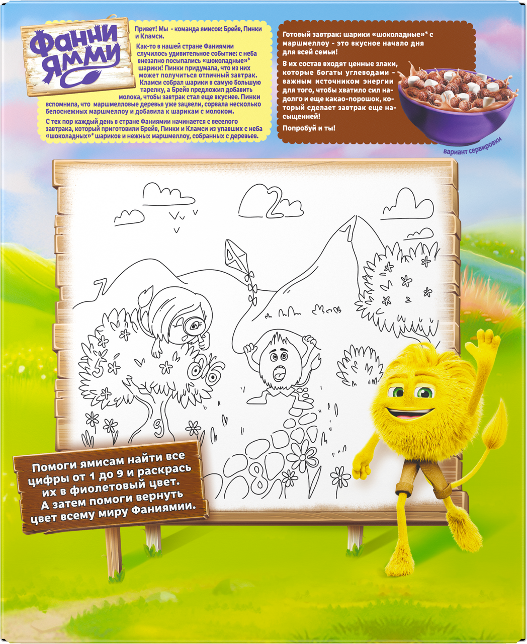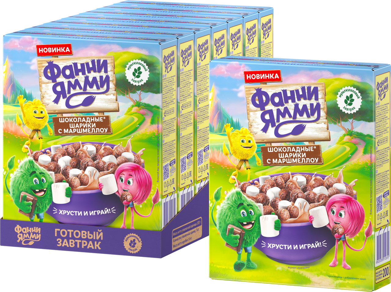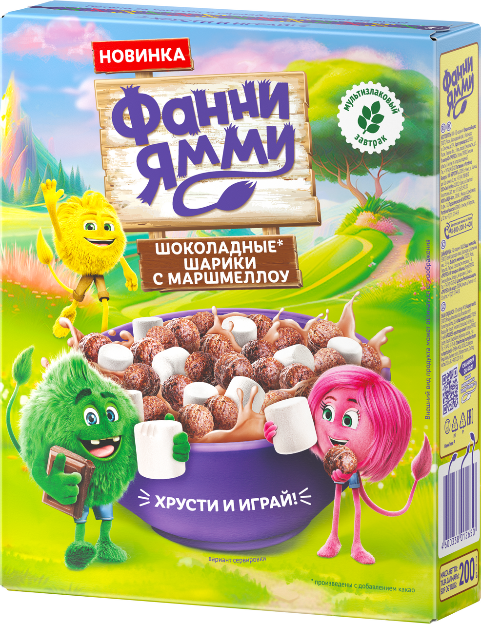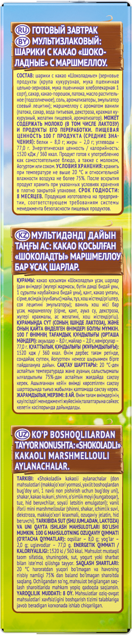 Шарики с какао Шоколадные (зерновые продукты (крупа кукурузная, мука пшеничная цельнозерновая, мука пшеничная хлебопекарная 1 сорт), сахар, какао-порошок, патока, масло растительное (подсолнечное), соль, ароматизаторы, эмульгатор соевый лецитин), маршмеллоу с ароматом ванили (патока, сахар, вода питьевая, декстроза, крахмал кукурузный, желатин пищевой, ароматизатор).