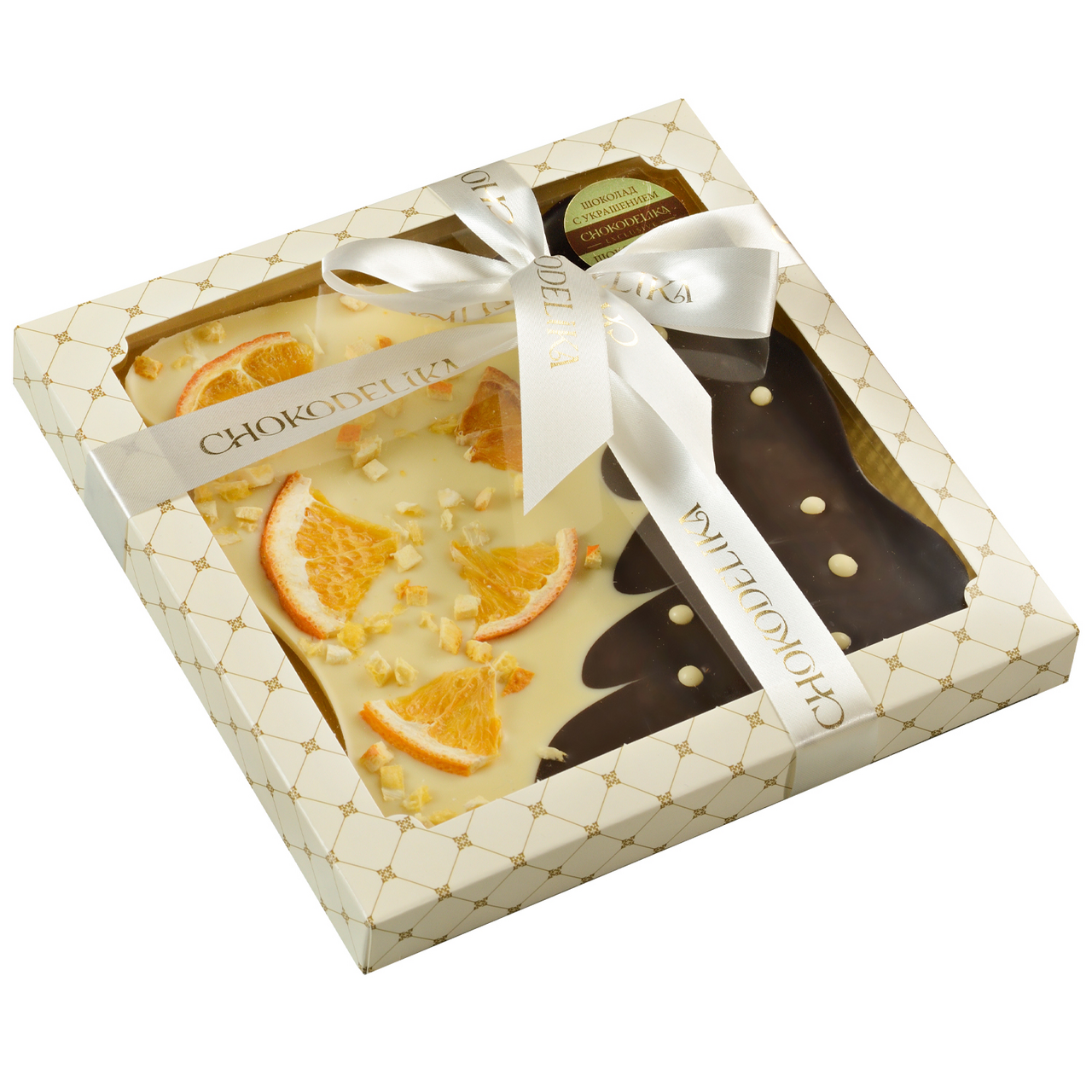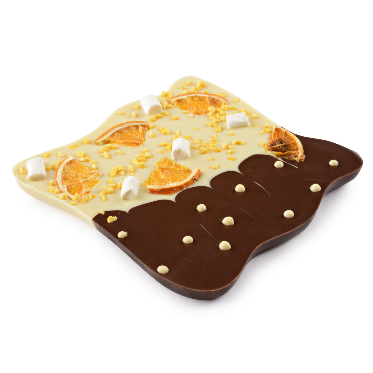 Темный шоколад (какао тертое, сахар, масло какао, эмульгатор: соевый лецитин, натуральный ароматизатор ванильный), белый шоколад (сахар, масло какао, цельное сухое молоко, эмульгатор: соевый лецитин, натуральный ароматизатор ванильный), апельсин сушеный, зефир воздушный (сахар-песок, патока, ароматизатор натуральный ванильный, вода питьевая, желатин пищевой, глюкоза кристаллическая, крахмал кукурузный высшего сорта), воздушный рис в белом шоколаде.