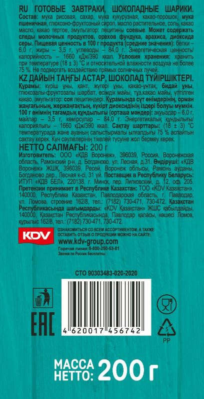 Рисовая мука, сахар, кукурузная мука, какао-порошок, глюкозно-фруктозный сироп, соль, масло растительное, какао масло, какао тертое, эмульгатор: лецитины соевые. Может содержать следы молочных продуктов, арахиса, орехов фундука, диоксида серы.