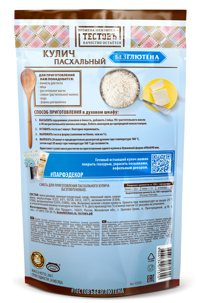 Нежный вкус и воздушная текстура, как у традиционного пасхального кулича.Не требует добавления дрожжей.Не содержат глютен - подтверждено сертификатом AOECS RU-014-015.Без лактозы.Безопасная герметичная упаковка.Не содержит красителей.