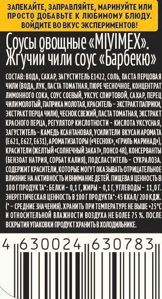Вода, сахар, загуститель Е1422, соль, паста перцовая чили (вода, лук, паста томатная, пюре чесночное, концентрат лимонного сока, соус соевый, уксус спиртовой, сахар, перец чили молотый, паприка молотая, краситель - экстракт паприки, экстракт перца чили), чеснок свежий, паста томатная, экстракт красного перца, регулятор кислотности - кислота уксусная, загуститель - камедь ксантановая, усилители вкуса и аромата (глутамат натрия, Е627, Е631), ароматизаторы: чеснок, гриль маринад, красители (жёлтый солнечный закат, понсо 4R), консерванты (бензоат натрия, сорбат калия), подсластитель - сукралоза.