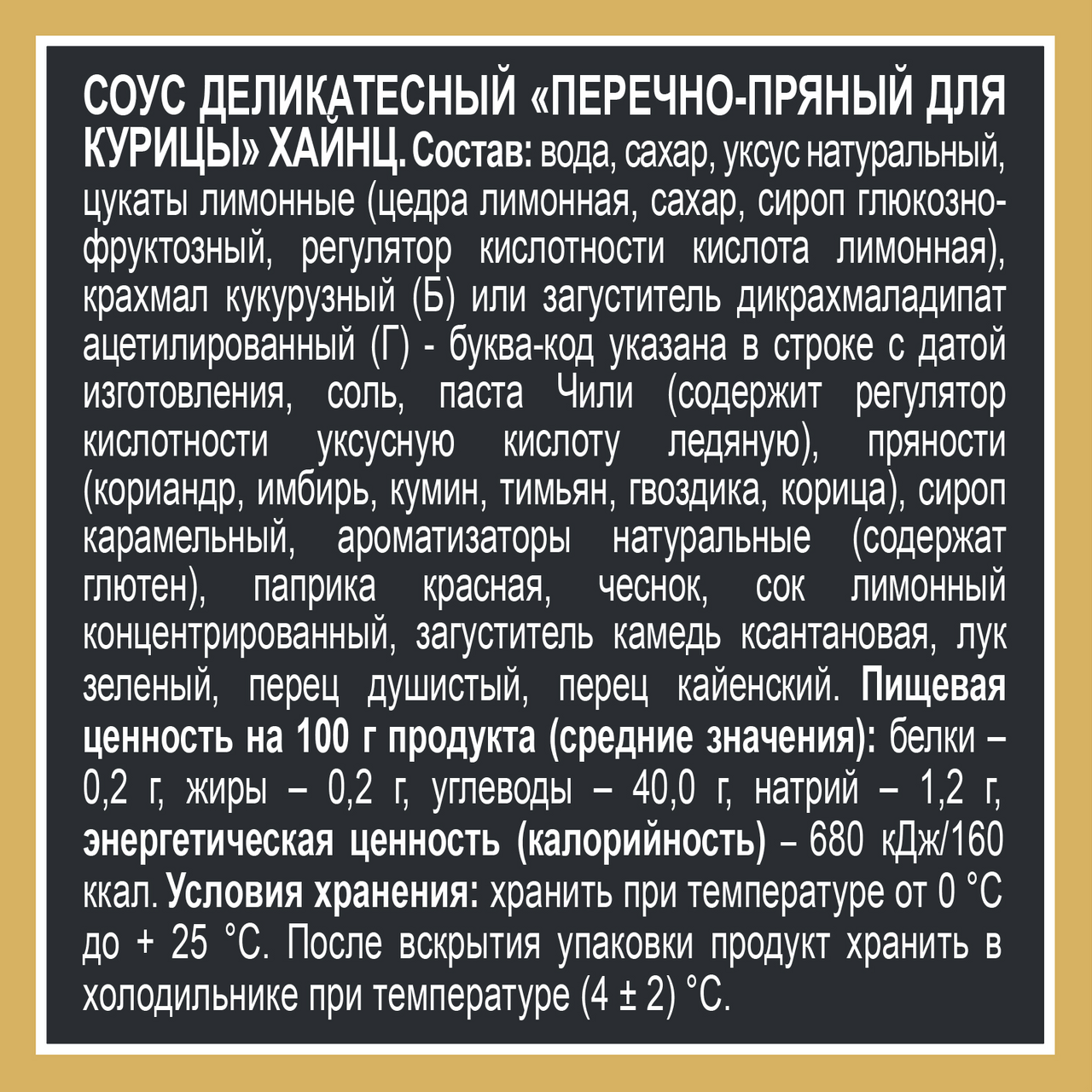 Вода, сахар, уксус натуральный, цукаты лимонные (цедра лимонная, сахар, сироп глюкозно-фруктозный, регулятор кислотности кислота лимонная), крахмал кукурузный (Б) или загуститель дикрахмаладипат ацетилированный (Г) - буква-код указана в строке с датой изготовления, соль, паста Чили (содержит регулятор кислотности уксусную кислоту ледяную), пряности (кориандр, имбирь, кумин, тимьян, гвоздика, корица), сироп карамельный, ароматизаторы натуральные (содержат глютен), паприка красная, чеснок, сок лимонный концентрированный, загуститель камедь ксантановая, лук зеленый, перец душистый, перец кайенский.
