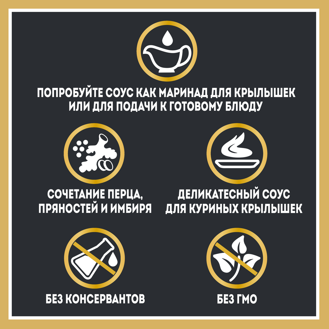 Деликатесный соус для куриных крылышек, сочетание перца, пряностей и имбиря, без консервантов и ГМО. Попробуйте соус как маринад для крылышек или для подачи к готовому блюду. Идеальное сочетание перца, пряностей и имбиря. Попробуйте подать изысканный соус как маринад для крылышек или просто к готовому блюду из курицы и риса.