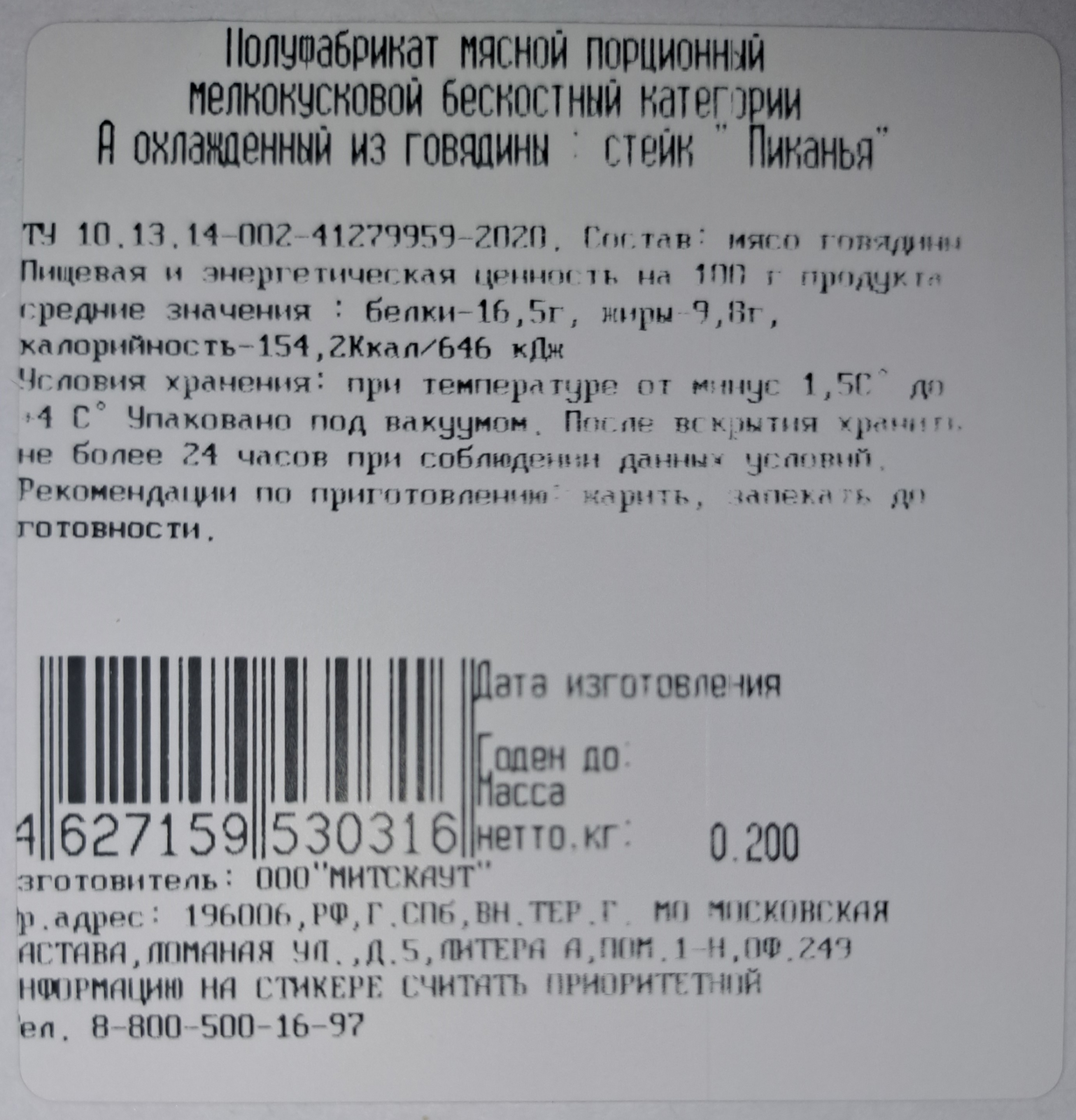 Стейк из мраморной говядины Myasoet Meat Company Пиканья охлажденный, 200г