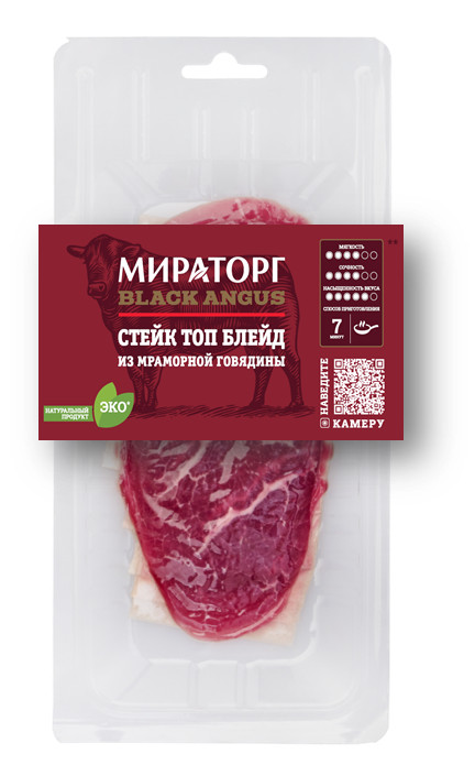Стейк Топ Блейд из мраморной говядины Black Angus вырезается из блейда, который выделяется из лопаточной части.Сочный и нежный альтернативный стейк, лишь немного уступающий по своим характеристикам премиальным стейкам.В приготовлении также прост, как и другие стейки. Подробный рецепт размещен на обратной стороне этикетки.