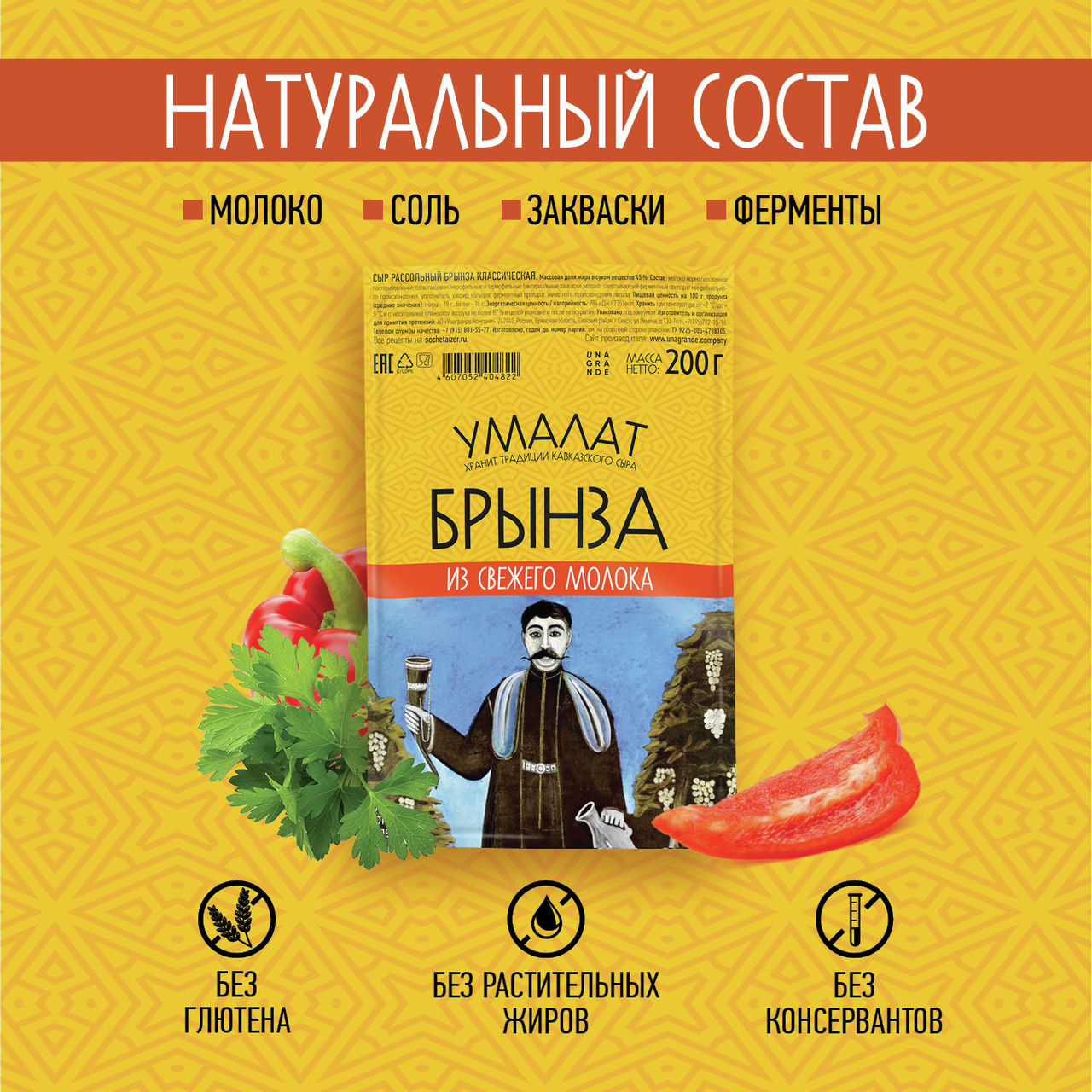Молоко нормализованное пастеризованное, соль пищевая, мезофильные и термофильные бактериальные закваски, молокосвертывающий ферментный препарат микробиального происхождения, уплотнитель хлорид кальция, ферментный препарат животного происхождения липаза.
