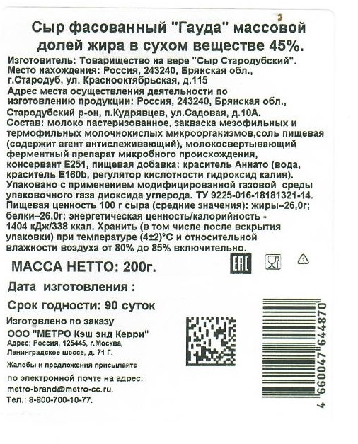 Молоко пастеризованное, закваска мезофильных и термофильных молочнокислых микроорганизмов, соль пищевая (содержит агент антислеживающий), молокосвертывающий ферментный препарат микробного происхождения, консервант Е251, пищевая добавка: краситель Аннато (вода, краситель Е160b, регулятор кислотности гидроксид калия).