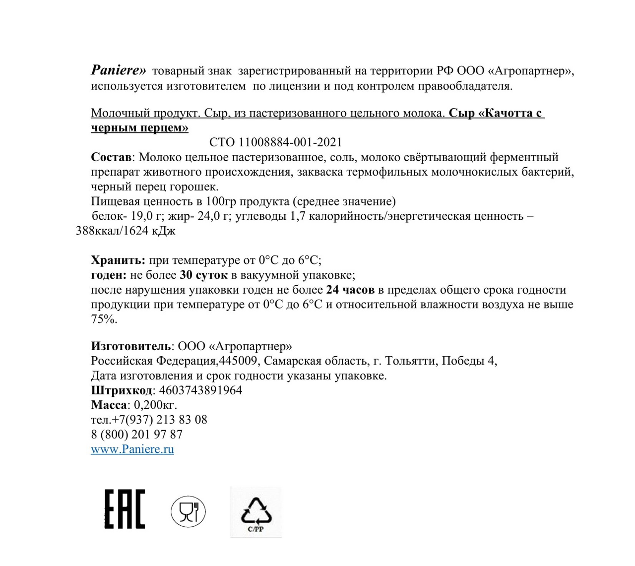 Сыр Paniere Качотта с черным перцем полутвердый 24%, 200г