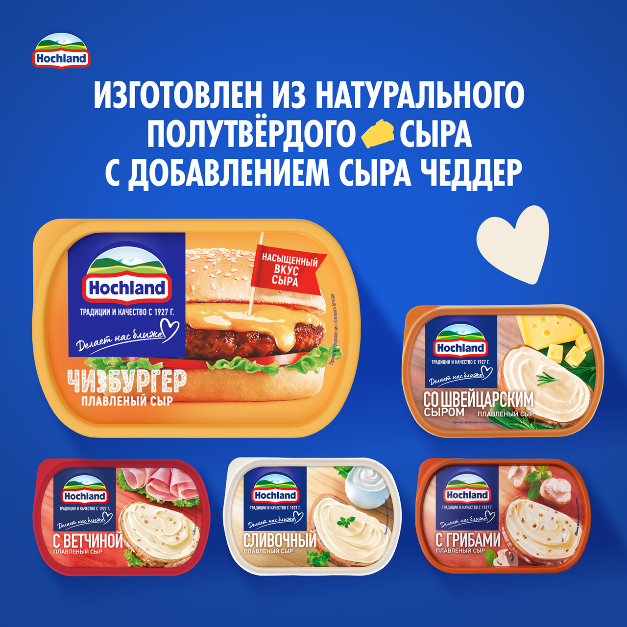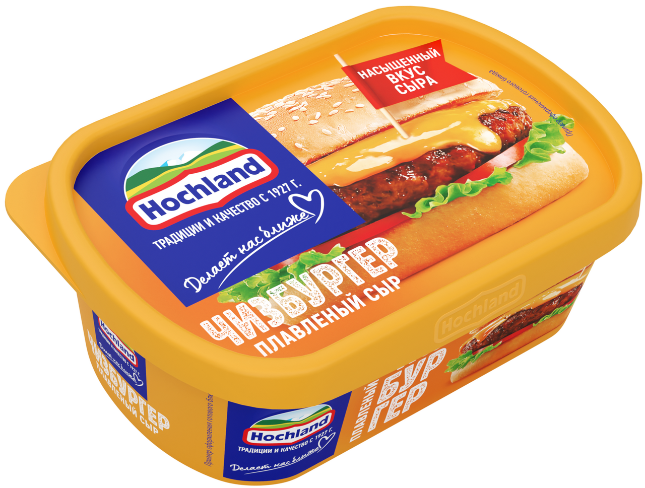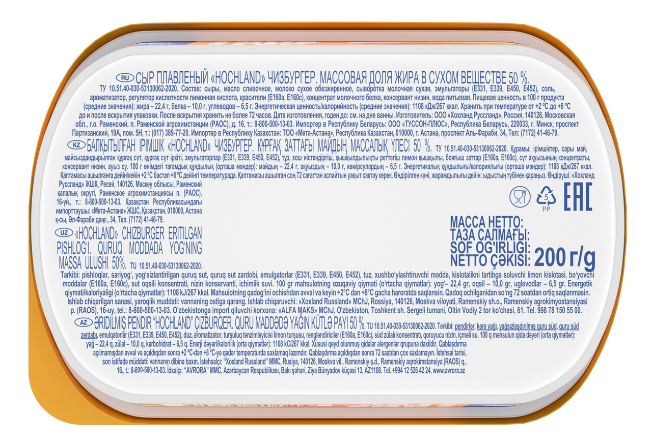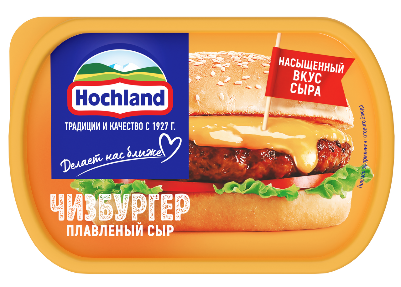 Теперь в твоём бутерброде столько сыра, сколько захочешь!Сыр плавленый Hochland Чизбургер - изготовленный из классического натурального сыра с добавлением сыра Чеддер, он обладает нежной текстурой и аппетитным ароматом, подчеркнутым сладковатой ноткой. Благодаря насыщенному вкусу он сделает каждое блюдо более ароматным и вкусным.Плавленый сыр Чизбургер от Hochland отлично подходит для утреннего бутерброда, сочного бургера или любимого сэндвича, добавляя им яркий вкус и аппетитный вид.Упакованный в ванночку объемом 200 граммов, этот сыр легко использовать и хранить.