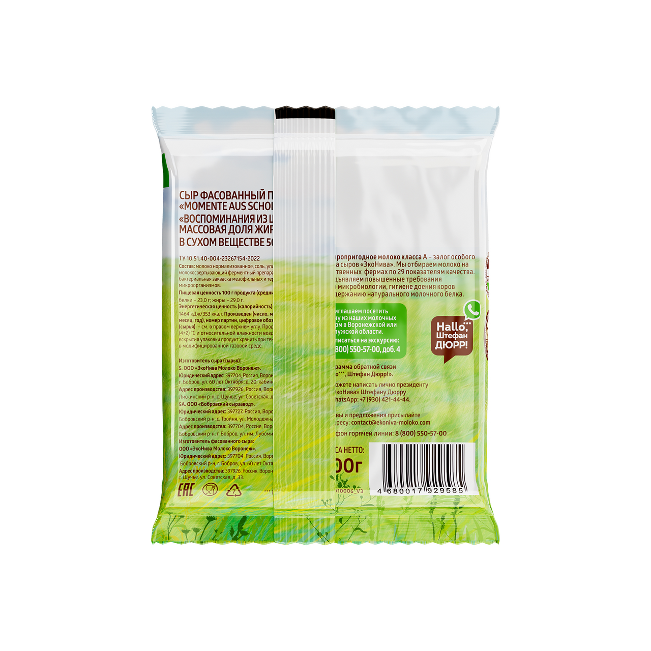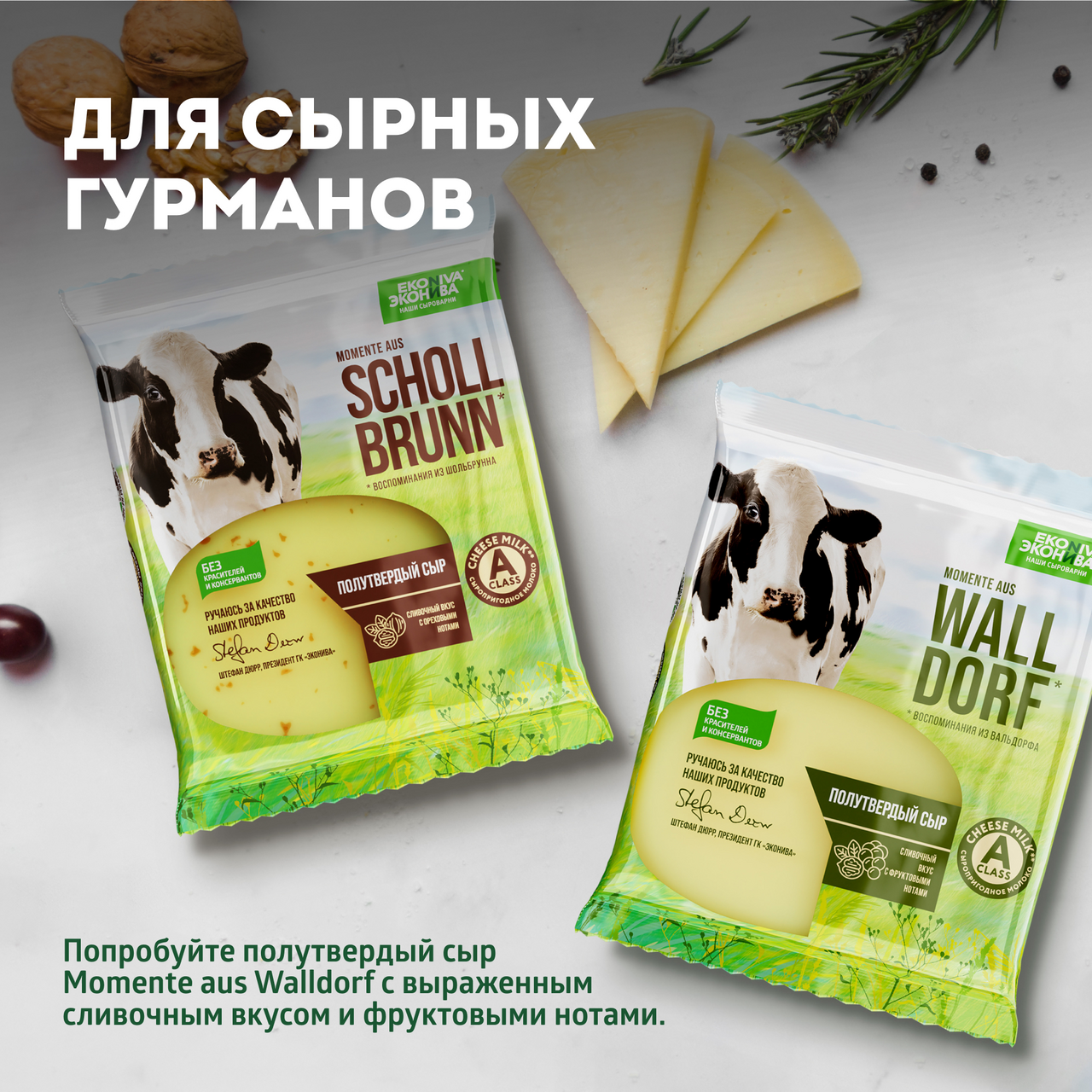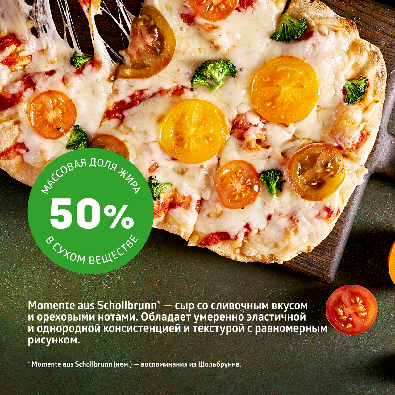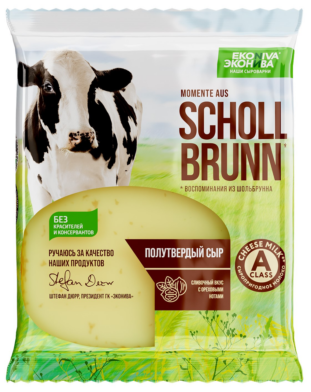 Полутвердый сыр Momente aus Schollbrunn (Воспоминания из Шольбрунна) вдохновлен памятными моментами юных лет Штефана Дюрра — основателя и президента компании ЭкоНива. Мы производим сыр Momente aus Schollbrunn в лучших традициях сыроварения по уникальной рецептуре. Племенные коровы едят питательный корм из сельскохозяйственных культур, выращенных на плодородных черноземных почвах, близ реки Дон. Буренки радуют нас большими надоями сыропригодного молока, отобранного по 29 параметрам качества. Из него мы создаем полутвердый сыр, который обладает сливочным вкусом с ореховыми нотами. Его консистенция умеренно эластичная и однородная, а текстура с равномерным рисунком. Применение: универсален как для самостоятельного употребления, так и для приготовления легких закусок, сэндвичей, салатов или канапе. При запекании в духовке образует аппетитную золотистую корочку, поэтому отлично подойдет для соусов и блюд с использованием сыра, таких как жюльен и лазанья.