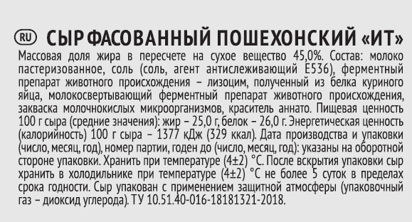 Молоко пастеризованное, соль (соль, агент антислеживающий Е536), ферментный препарат животного происхождения – лизоцим, полученный из белка куриного яйца, молокосвертывающий фермент-ный препарат животного происхождения, закваска молочнокислых микроорганизмов, краситель аннато.