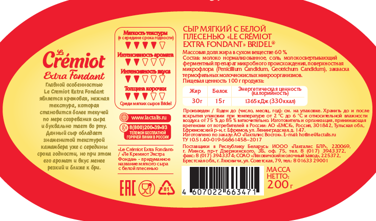 Молоко нормализованное, соль, молокосвертывающий ферментный препарат микробного происхождения, поверхностная микрофлора (Penicillium Candidum, Geotrichum Candidum), закваска термофильных молочнокислых микроорганизмов.