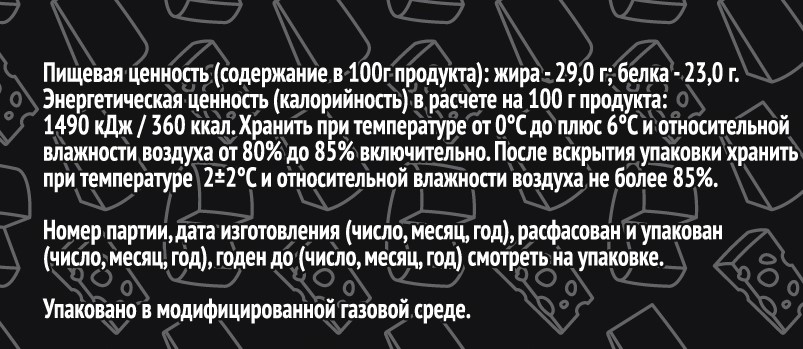 Пастеризованное молоко, пищевая соль, мезофильные молочнокислые микроорганизмы, молокосвертывающий ферментный препарат животного происхождения, уплотнитель хлорид кальция, консервант нитрат натрия, краситель натуральный Аннато экстракт вода, натуральный краситель E160b, регулятор кислотности Е525, пищевой эмульгатор Е433.