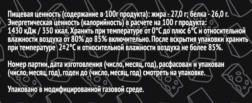 Пастеризованное молоко, пищевая соль, мезофильные молочнокислые микроорганизмы, молокосвертывающий ферментный препарат животного происхождения, уплотнитель хлорид кальция Е509, консервант нитрат натрия Е251, краситель натуральный Аннато экстракт Е160b вода, натуральный краситель E160b, регулятор кислотности Е525, пищевой эмульгатор Е433.