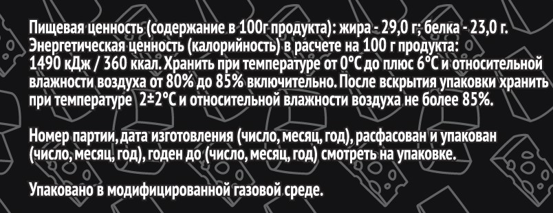 Пастеризованное молоко, пищевая соль, мезофильные молочнокислые микроорганизмы, молокосвертывающий ферментный препарат животного происхождения, уплотнитель хлорид кальция, консервант нитрат натрия, краситель натуральный Аннато экстракт (вода, натуральный краситель (E160b), регулятор кислотности (Е525), пищевой эмульгатор (Е433)).
