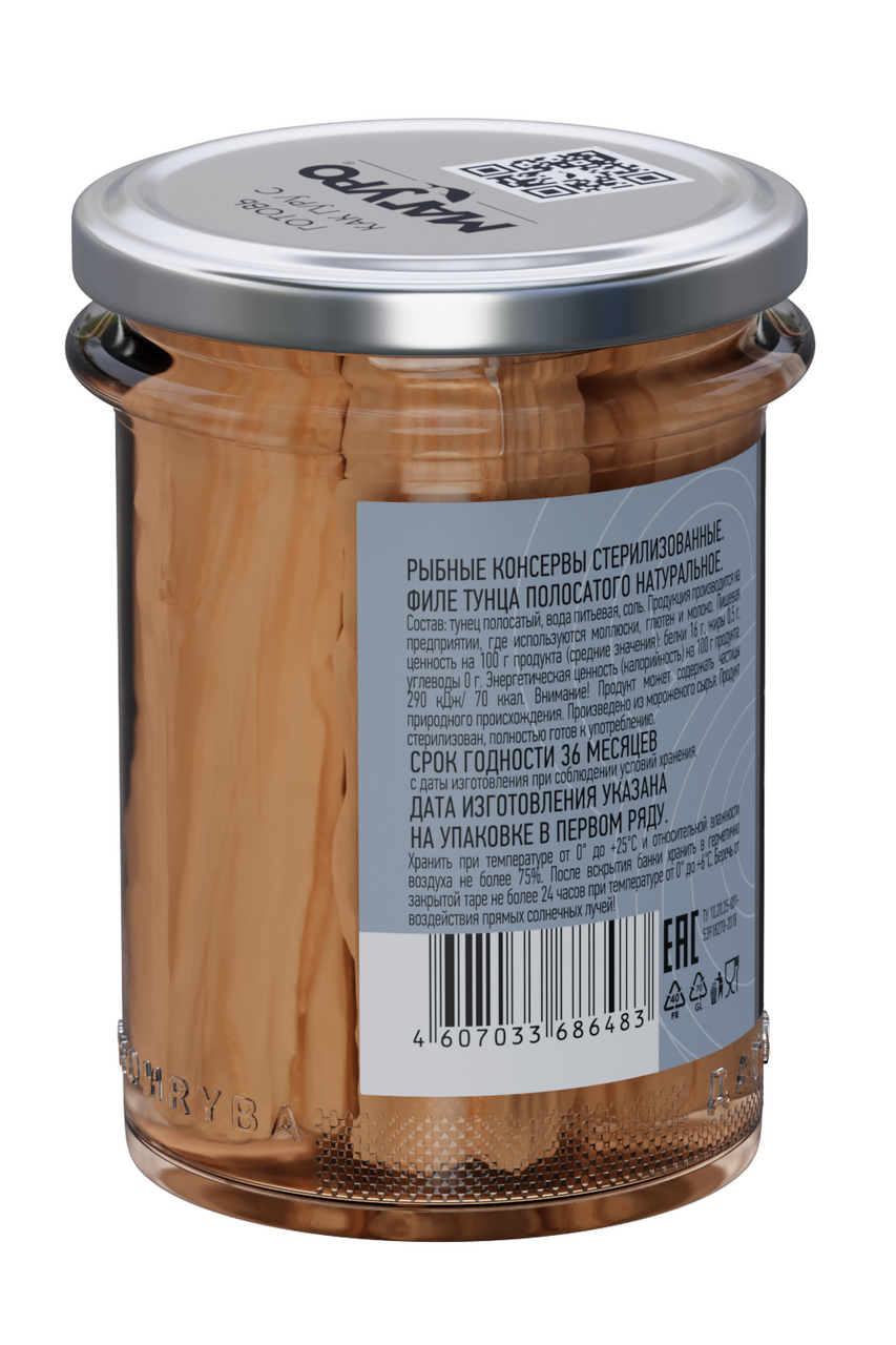 Натуральное филе тунца Магуро - идеальный продукт для тех, кто выбирает сочетание пользы и качества.В нем всего лишь три ингредиента: тунец, вода и щепотка морской соли!Нежное и сочное мясо редкого полосатого тунца содержит жирные кислоты Омега-3 и является источником белка. Премиальное качество продукта легко оценить еще до покупки - прозрачная стеклянная банка подчеркивает эстетичный вид крупных кусочков благородной дикой рыбы.