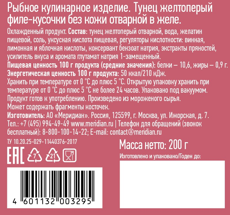 Тунец желтоперый отварной, вода, желатин пищевой, клюква, соль, уксусная кислота пищевая, регуляторы кислотности: винная, лимонная и яблочная кислоты, консервант бензоат натрия, экстракты пряностей, усилитель вкуса и аромата глутамат натрия 1-замещенный.