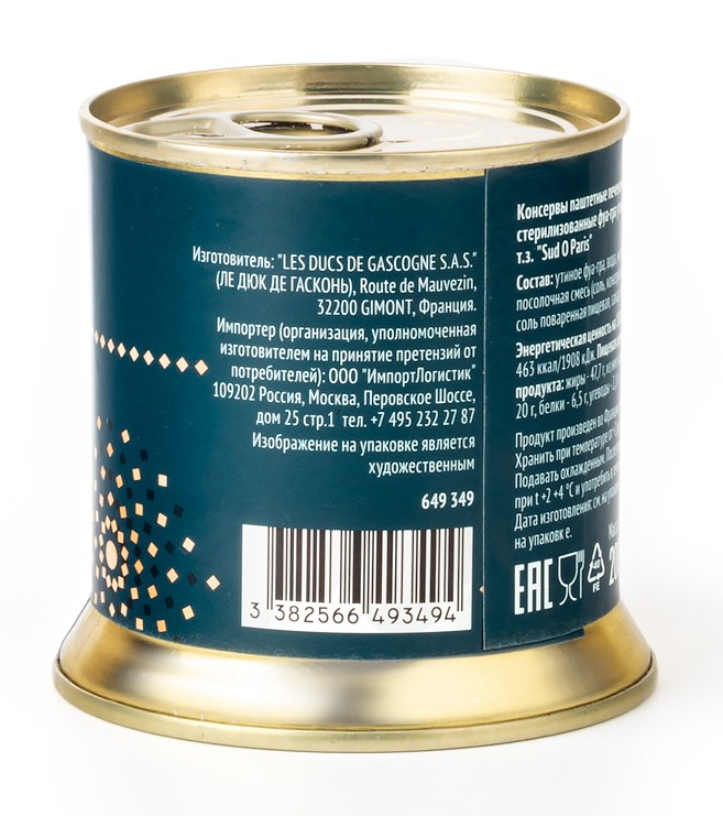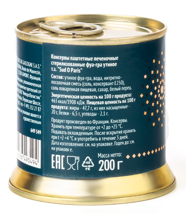 Утиное фуа-гра, вода, нитритно-посолочная смесь (соль, консервант Е250), соль поваренная пищевая, сахар, белый перец.