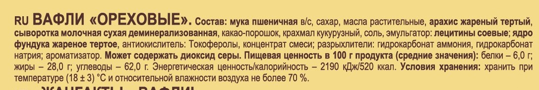 Мука пшеничная в/c, сахар, масла растительные, арахис жаренный тертый, сыворотка молочная сухая деминерализованная, какао-порошок, крахмал кукурузный, соль, эмульгатор: соевый лецитин; ядро фундука жареное тертое, антиокислитель: Е306; разрыхлители: гидрокарбонат аммония, гидрокарбонат натрия; ароматизатор. Возможно наличие следов: яичных продуктов; диоксида серы.