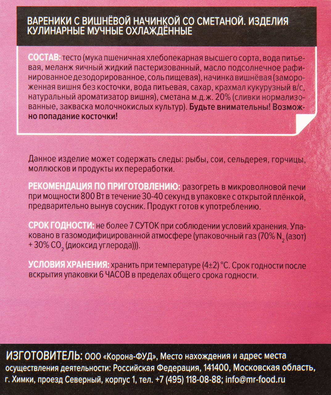 Тесто (мука пшеничная хлебопекарная высшего сорта, вода питьевая, меланж яичный жидкий пастеризованный, масло подсолнечное рафинированное дезодорированное, соль пищевая), начинка вишнёвая (замороженная вишня без косточки, вода питьевая, сахар, крахмал кукурузный в/с, натуральный ароматизатор вишня), сметана м. д. ж. 20% (сливки нормализованные, закваска молочнокислых культур). Будьте внимательны! Возможно попадание косточки.