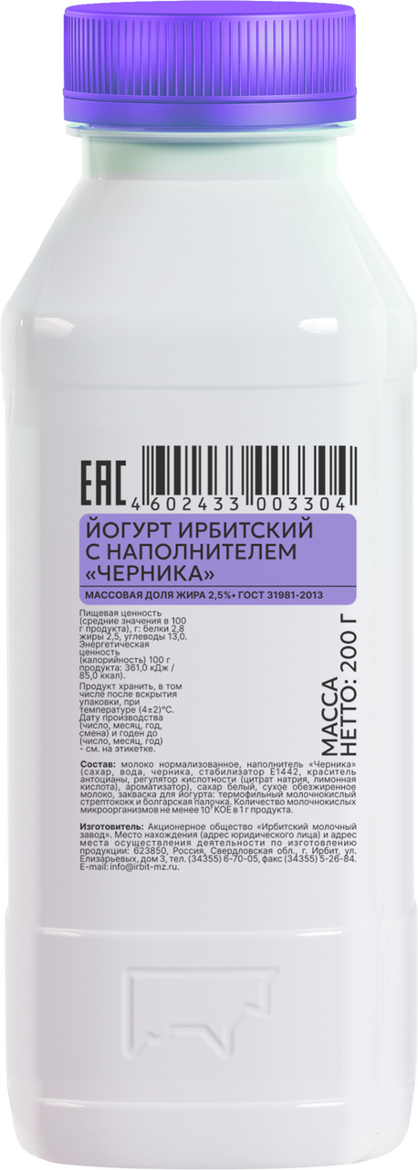 Йогурт питьевой Ирбитский молочный завод с черникой ГОСТ 2.5%, 200г