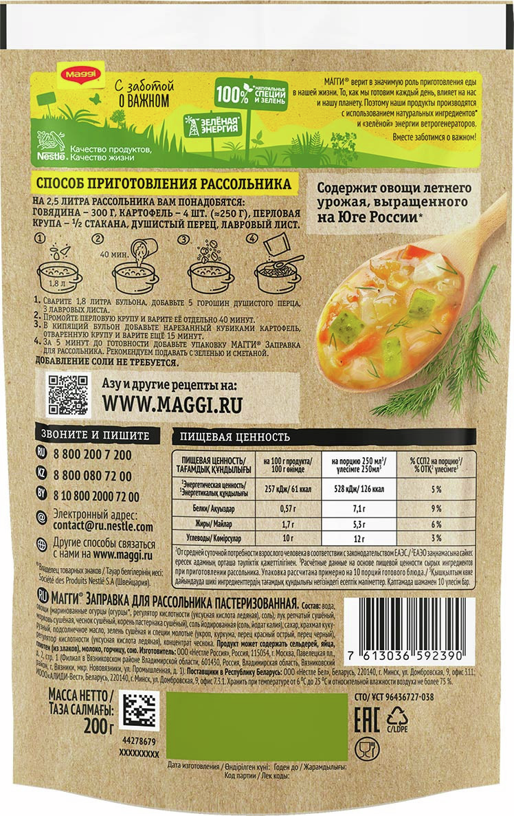 Рассольник – один из самых популярных супов, но его приготовление требует времени и особенных ингредиентов, которые не всегда есть под рукой. Maggi Заправка для рассольника поможет радовать семью вкусным и сытным Рассольником без лишних усилий. Maggi Заправка для рассольника уже содержит маринованные огурчики, лук, морковь и другие овощи, бережно пастеризованных со специями и зеленью. Добавьте Заправку Maggi в бульон с крупой и картофелем за 5 минут до готовности и ваш любимый рассольник готов. А также Maggi Заправка для рассольника подходит для приготовления вторых блюд, например, азу по-татарски с говядиной.