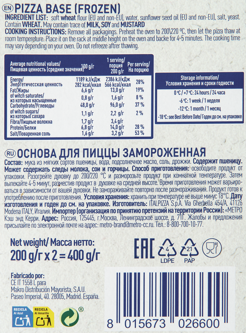METRO Chef Основа для пиццы замороженная (200г x 2шт), 400г предоставит полный простор для кулинарного творчества. Ее можно дополнить томатным соусом, сыром, ветчиной, шампиньонами, салями и другой начинкой по вашему вкусу. Диаметр основы 27 см.