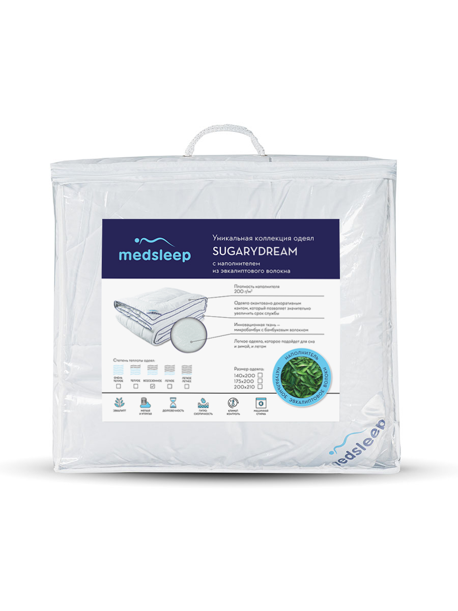 Крепкий, здоровый сон – залог хорошего самочувствия и прекрасного утреннего настроения для каждого из нас. Компания Medsleep, производитель домашнего текстиля создает прекрасные коллекции подушек и одеял, комбинируя натуральные и искусственные наполнители и разнообразные ткани, используя новейшие технологии и опираясь на инновационные разработки, – все это с целью создания условий для идеального сна.Выбирая изделия, покупатель ищет особый комфорт и отдых. И конечно, для каждого покупателя качественный сон – залог бодрости в течение всего следующего дня, что очень важно. Одеяло и подушка – важнейшие аксессуары для сна, поэтому так важен правильный их подбор, обеспечивающий комфортный и здоровый сон.Коллекция SUGARYDREAM бренда Medsleep – это изделия высокого качества, выполненные из экологичного микробамбука, бамбука и эвкалиптового волокна. Эвкалиптовое волокно, как и шелк, обладает функцией климат-контроля, поэтому изделия с таким наполнителем поддерживает комфортную температуру в любое время года. Искусственно созданный экологически безопасный Лебяжий пух ULTRA SOFT представляет собой тончайшее силиконизированное микроволокно, нежное и упругое. Это инновационный материал, который обладает всеми свойствами натурального лебяжьего пуха. Он быстро восстанавливает свою форму после сжатия. Подушка средней высоты подходит для сна на животе и спине.