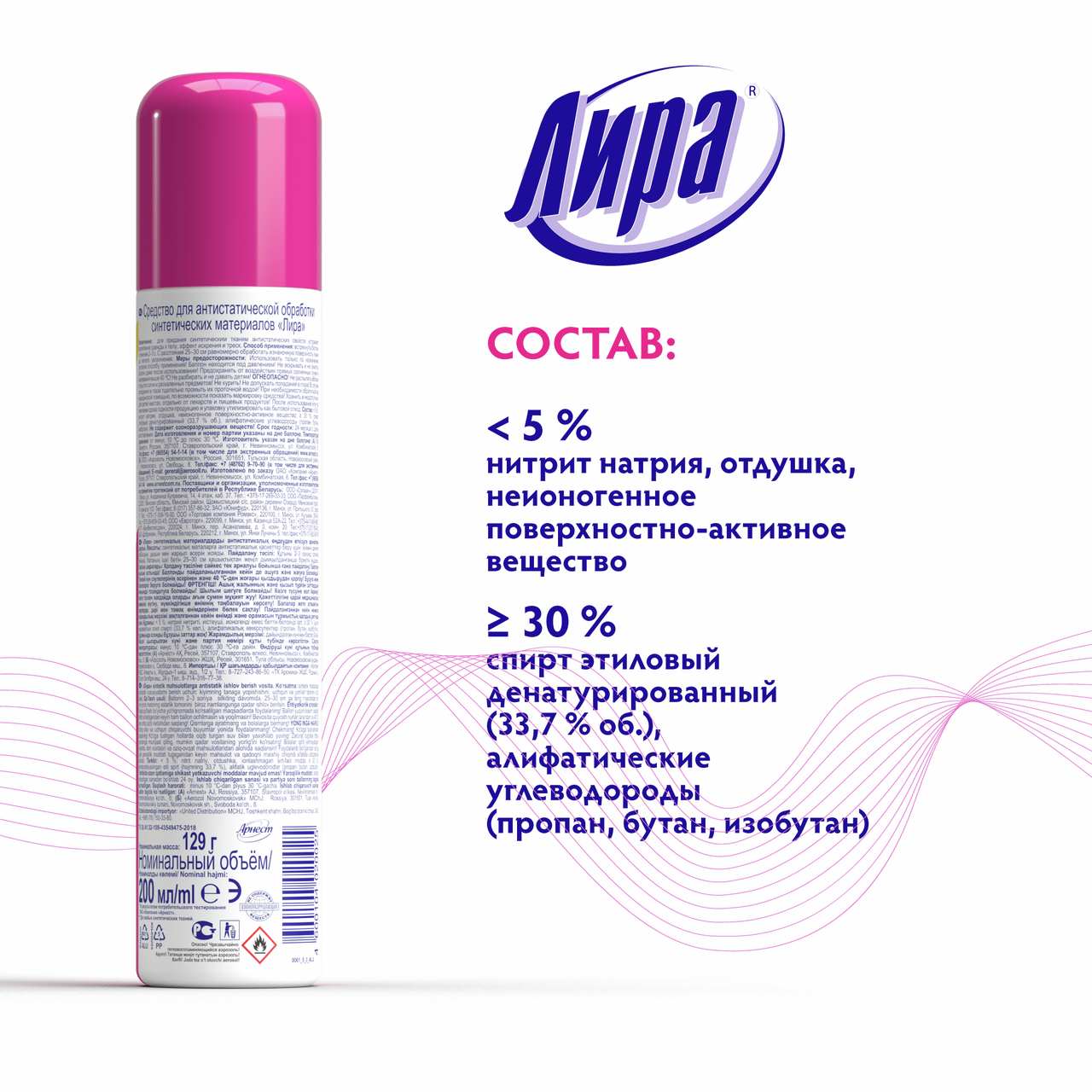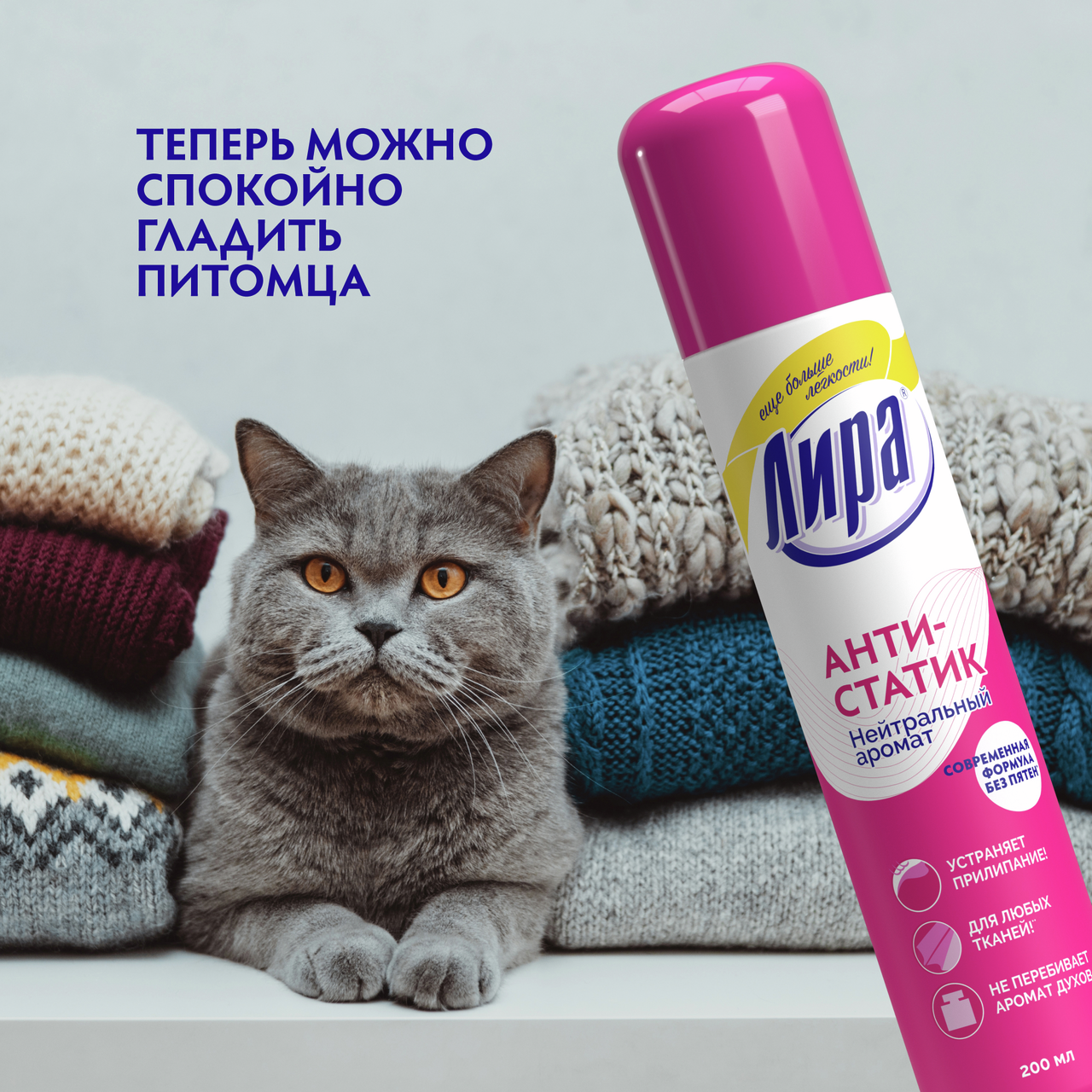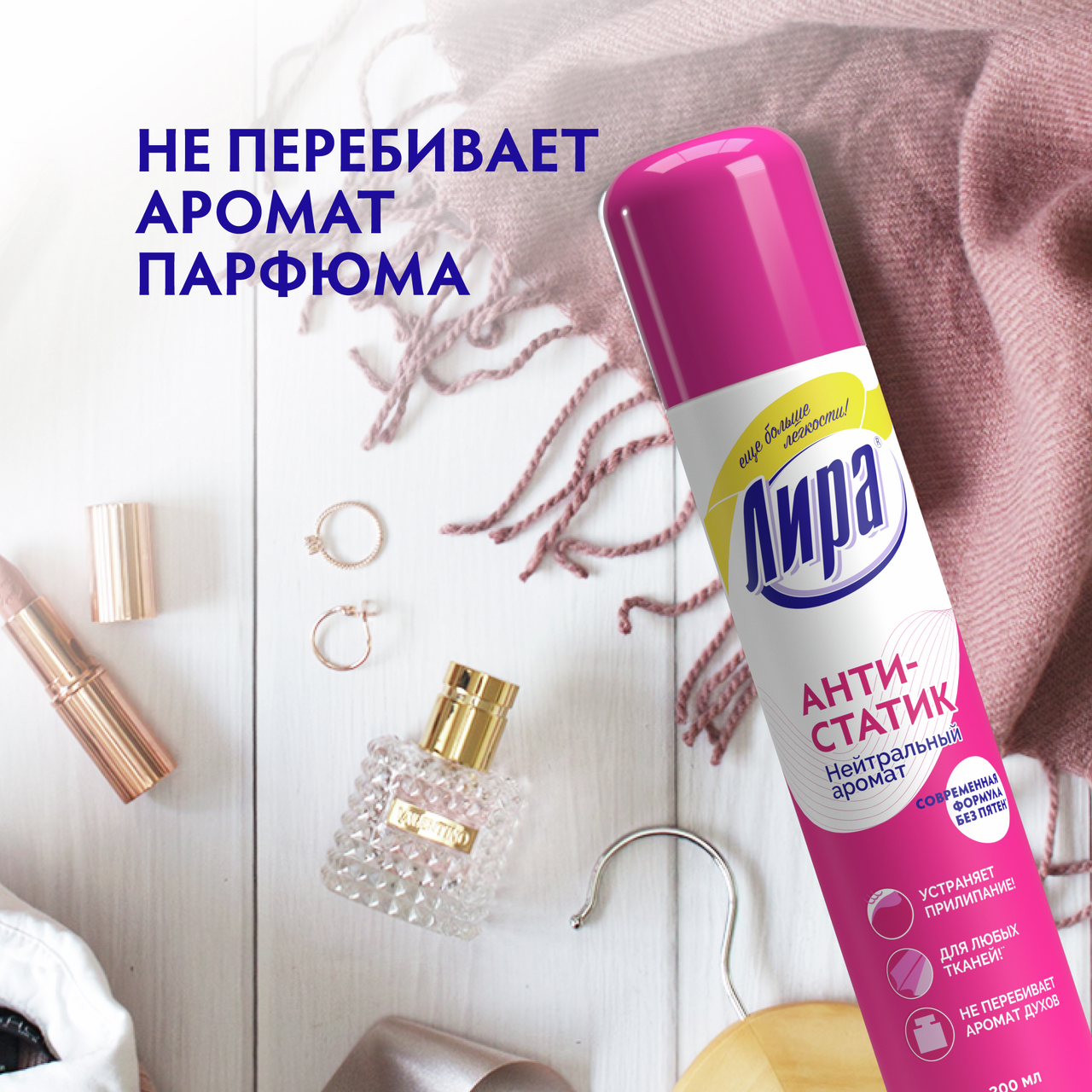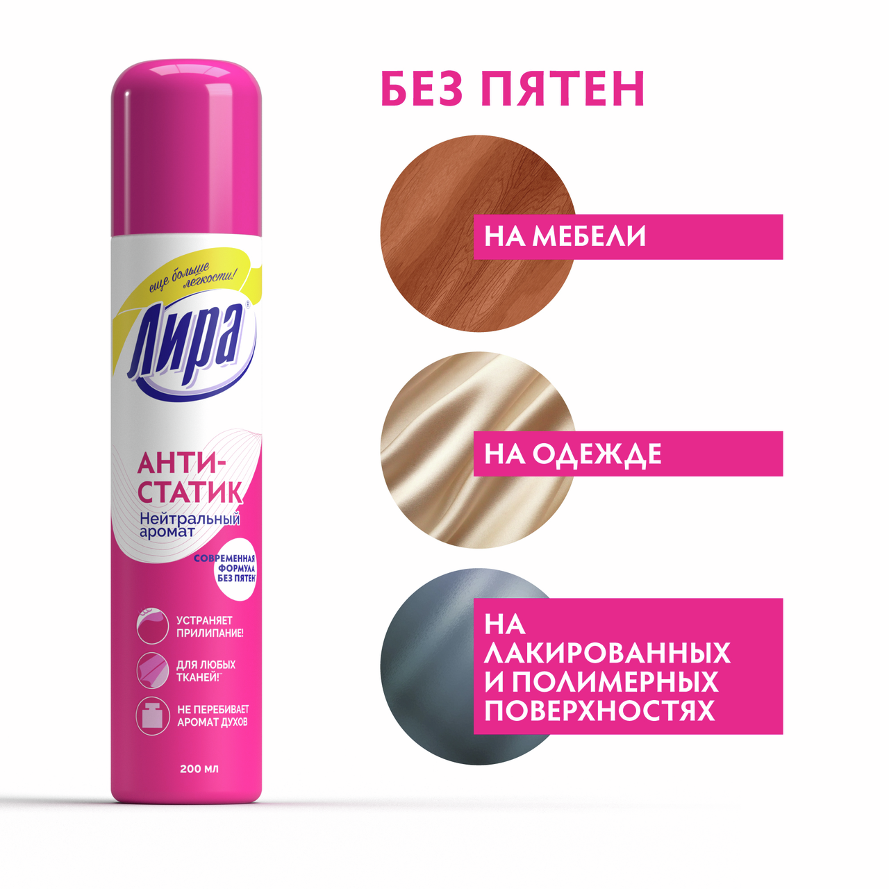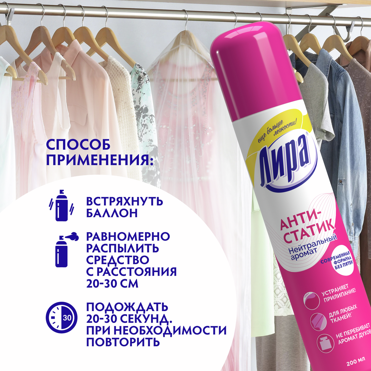 Антистатик для одежды Лира —незаменимый помощник в борьбе со статическим электричеством. Он легко справляется с накопленным зарядом, предотвращая прилипание ткани к телу, искрение и треск, обеспечивая вам уверенность и комфорт в своем образе до 24 часов. Спрей станет отличным выбором для ухода за различными тканями, идеально подходя для юбок, платьев, колготок и другой одежды. Антистатик Лира выпускается без сильного запаха, имеет легкий нейтральный аромат, который не перебьет ваш парфюм. Это универсальное средство также эффективно для использования на мебели и других тканевых поверхностях, обеспечивая их гладкость и комфортное использование., а также защищая от шерсти животных. Спрей для текстиля быстро высыхает, не оставляя пятен и следов на ткани, поэтому ваши вещи всегда будут выглядеть аккуратно и свежо. Простой и удобный в использовании аэрозоль — это полезный аксессуар для любого гардероба. Он работает как на натуральных, так и на синтетических тканях, делая его идеальным выбором для использования на предметах из деликатных материалов. Встряхните баллон в течение 3-5 секунд и нанесите на внутреннюю часть одежды, стараясь не допускать сухих промежутков. Уже через минуты вы полостью защищены от прилипания.