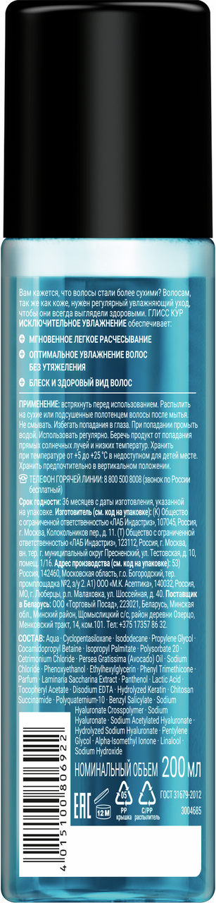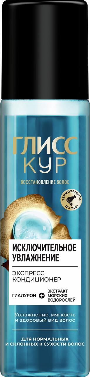 Экспресс-кондиционер для волос Глисс Кур Исключительное Увлажнение. Увлажненные и мягкие волосы с первым прикосновением? Теперь это возможно благодаря экспресс-кондиционеру Глисс Кур Исключительное Увлажнение! Идеально подходит для нормальных и сухих волос, этот спрей подарит вашим локонам необходимое увлажнение и мягкость. Средство для моментального восстановления волос, облегчения расчесывания и защиты прядей от механических повреждений. Формула оригинального продукта содержит экстракт морских водорослей, молочной кислотой, пантенолом и жидким кератином. Проникая в самую толщу волос, биоактивные компоненты заполняют пористую структуру, укрепляют ее, способствуют стойкому увлажнению и питанию шевелюры. Кондиционер действует сразу же после нанесения. Его не нужно смывать. Средство не оставляет ощущение липкости, не утяжеляет волосы, не влияет на их подвижность. Образующееся на волосах невесомое покрытие придает прядям живое сияние, гладкость и силу. Расчесывание и укладка не причиняют шевелюре ни малейшего вреда.