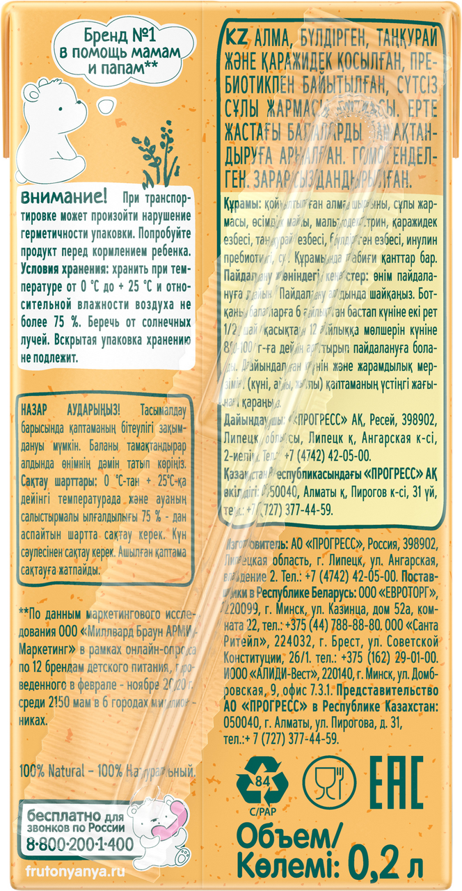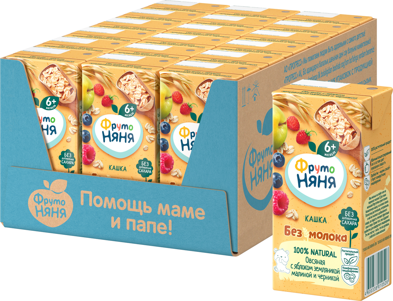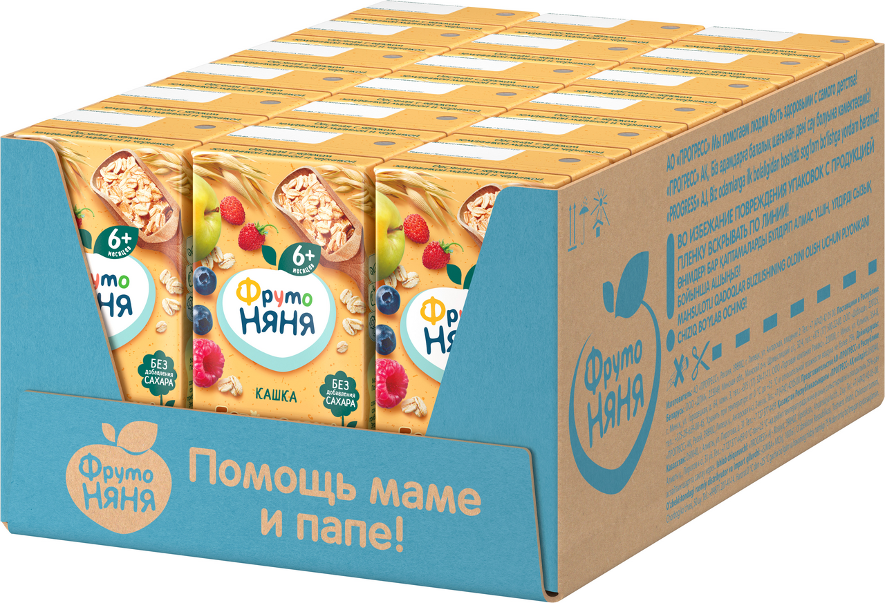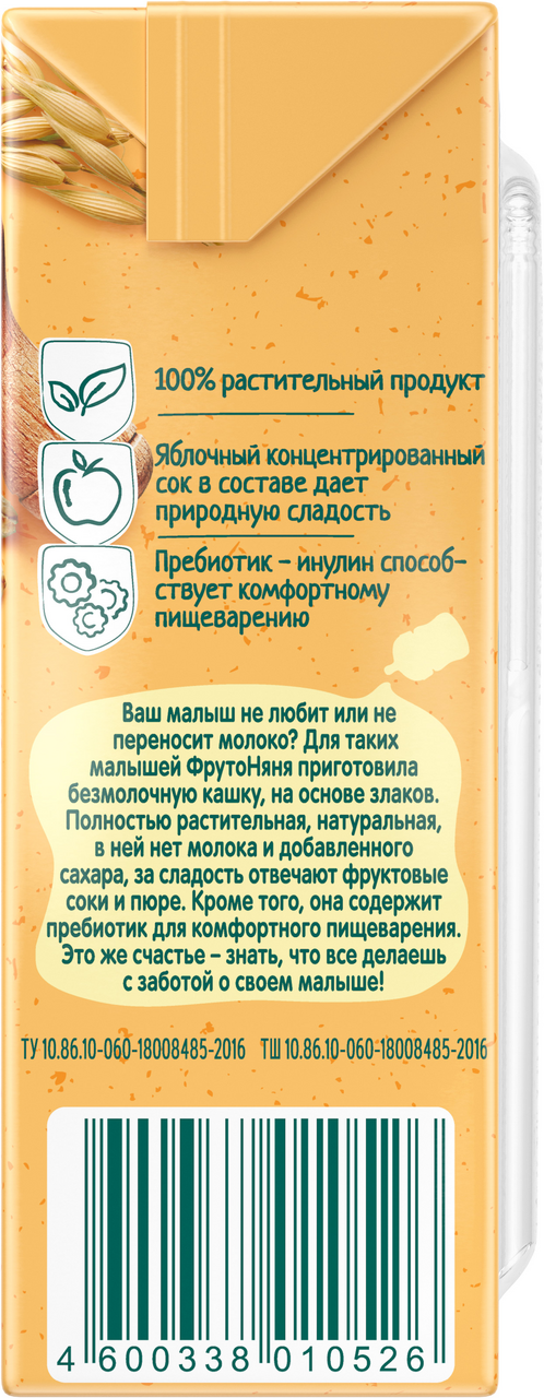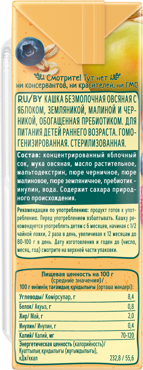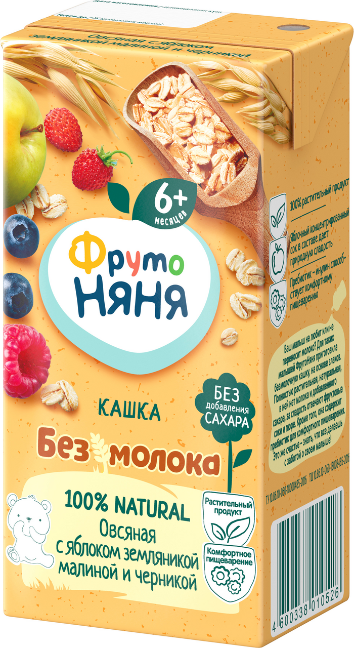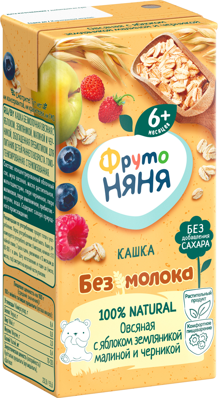 Жидкая безмолочная овсяная каша ФрутоНяня с яблоком, земляникой, малиной и черникой – идеальное решение сытного и полезного завтрака для детей с 6 месяцев, которые не переносят лактозу. Это полностью растительный продукт на основе злаков без молока и сахара. Натуральные фруктовые соки и пюре в составе делают кашку не только полезной, но и вкусной. Пребиотик дополнительно помогает маленьким животикам лучше усваивать пищу. Пусть ваш малыш начинает свой день радостно и здОрово с безмолочной кашей ФрутоНяня!