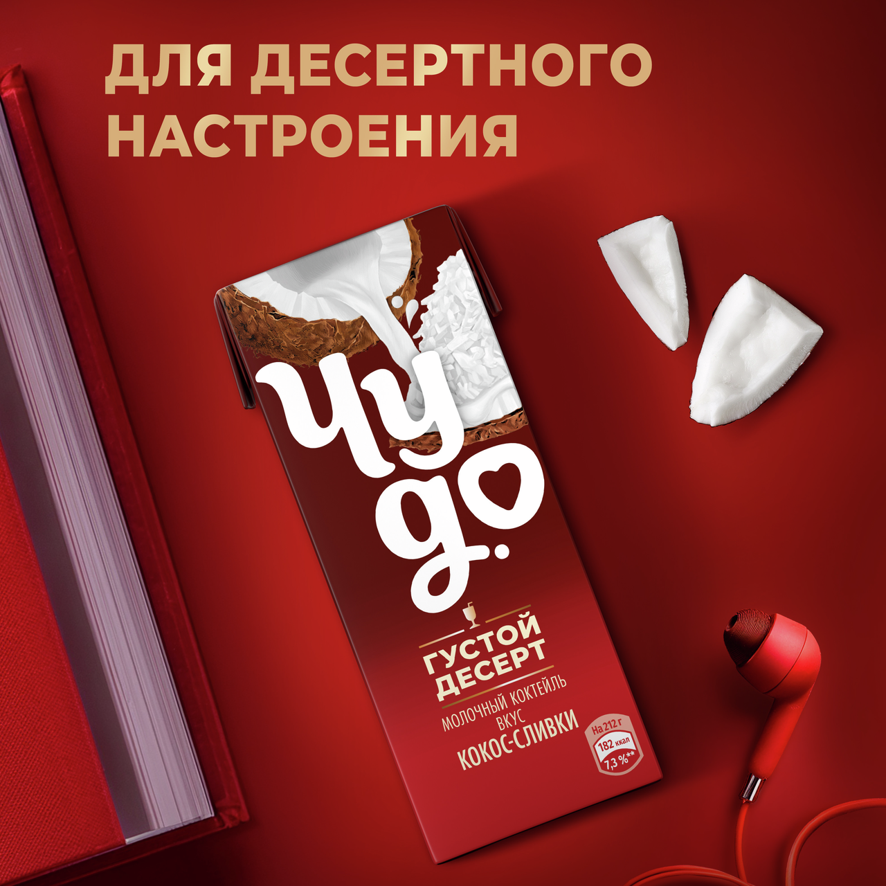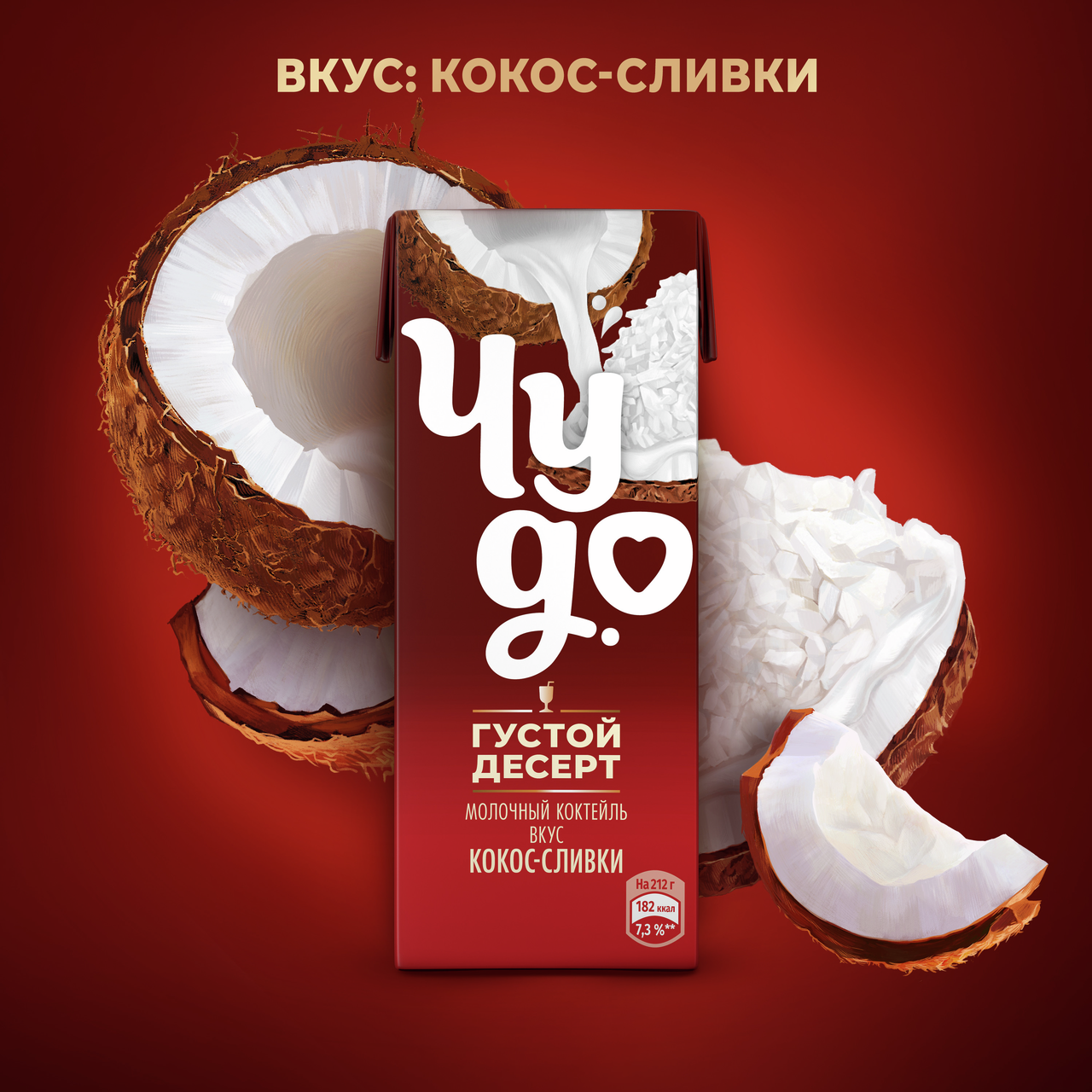 Молочный коктейль Чудо со вкусом кокоса и сливок из натурального молока без добавления консервантов. Напиток удобно взять с собой для вкусного перекуса в течение дня. Густой десерт не оставит равнодушным всю вашу семью. Бренд Чудо более 20 лет создаёт вкусные молочные продукты и десерты из отборных ингредиентов: питьевые йогурты, молочные коктейли, пудинги, глазированные сырки, творожки и йогурты с насыпками. Среди многообразия вкусов и текстур обязательно найдется что-то по вкусу каждому члену семьи. Обновленное Чудо прямо в сердечко!
