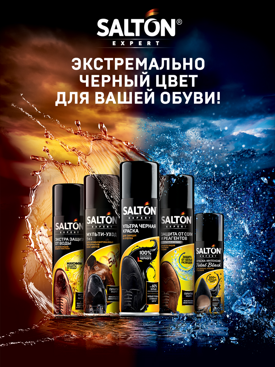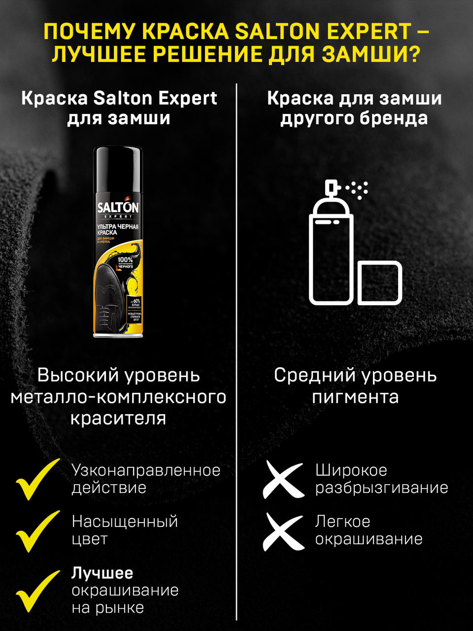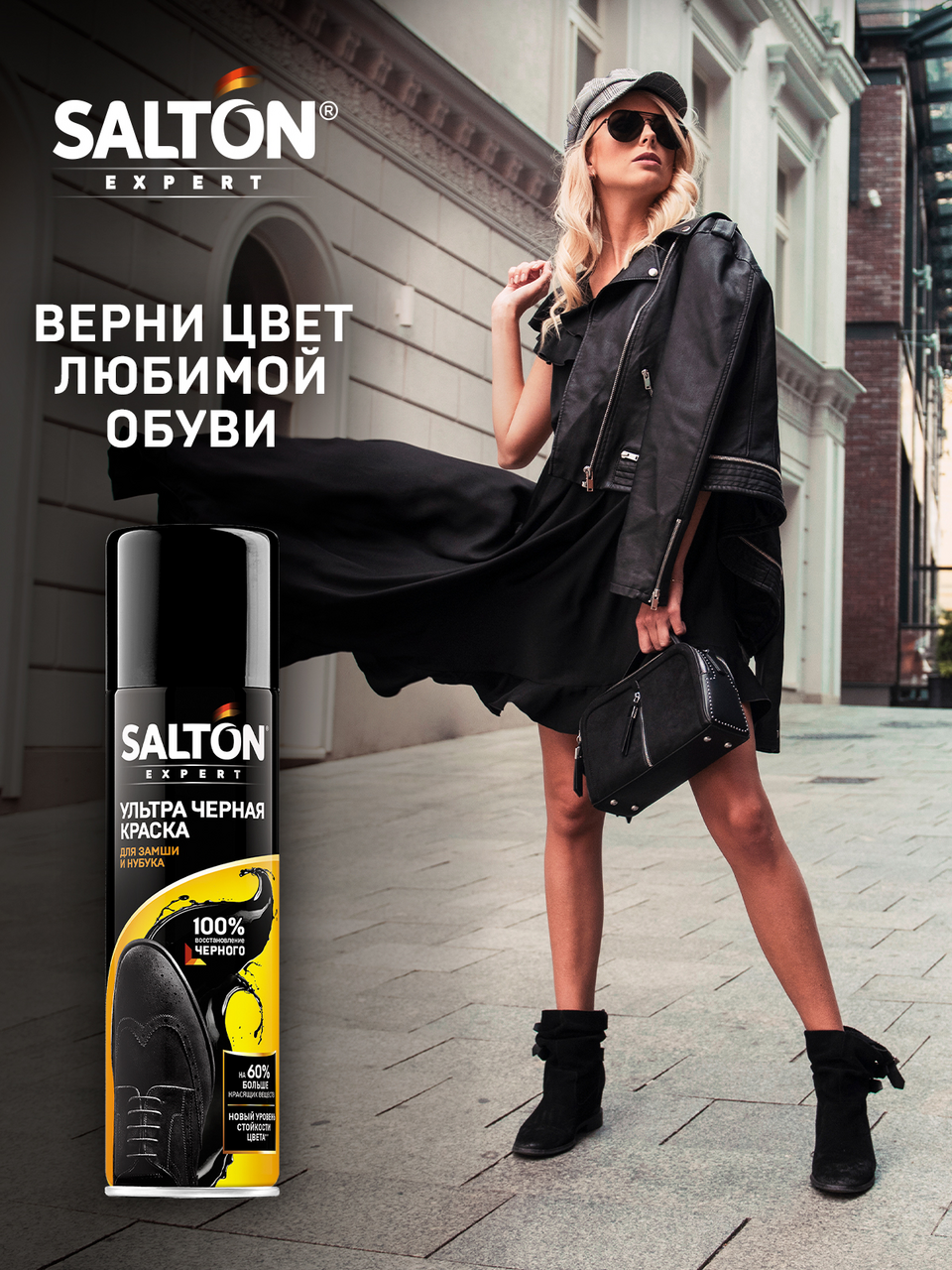 Полное восстановление черного цвета обуви, одежды и аксессуаров из замши и нубука 100% восстановление ЧЕРНОГО* На 60% больше красящих веществ**легко и быстро возвращает любимой паре 100% черный цвет Уникальные металлокомплексные красители ? насыщенный и устойчивый к выцветанию цвет*Согласно экспертной оценке НИЦБЫТХИМ; ** По сравнению с Salton Краска для обуви из замши, нубука, велюра, 2015г.