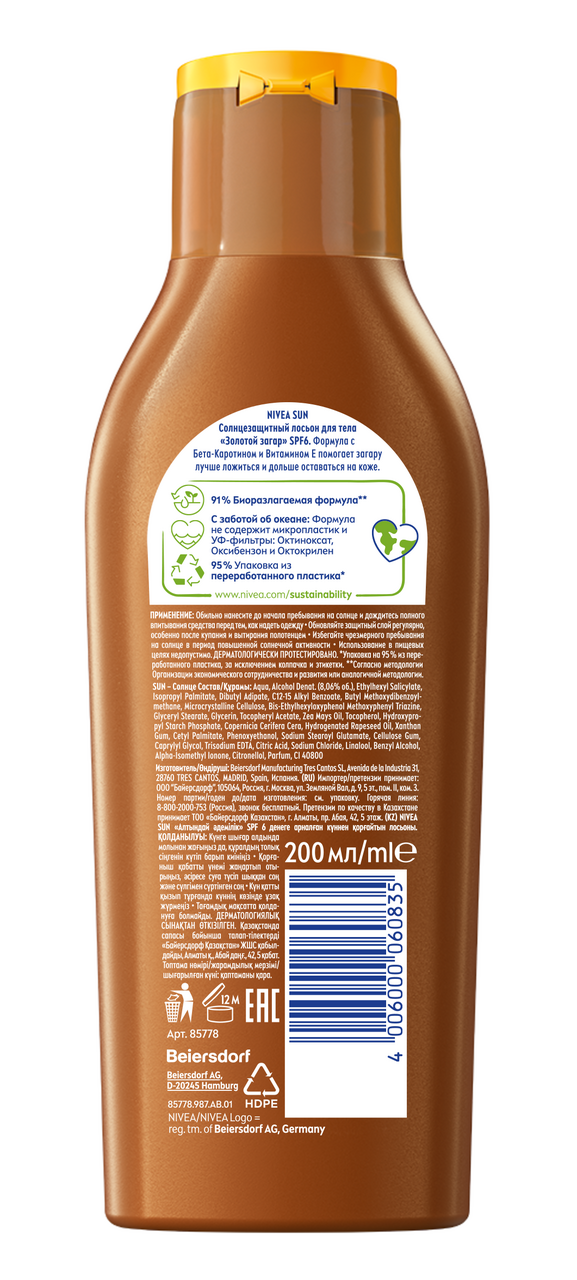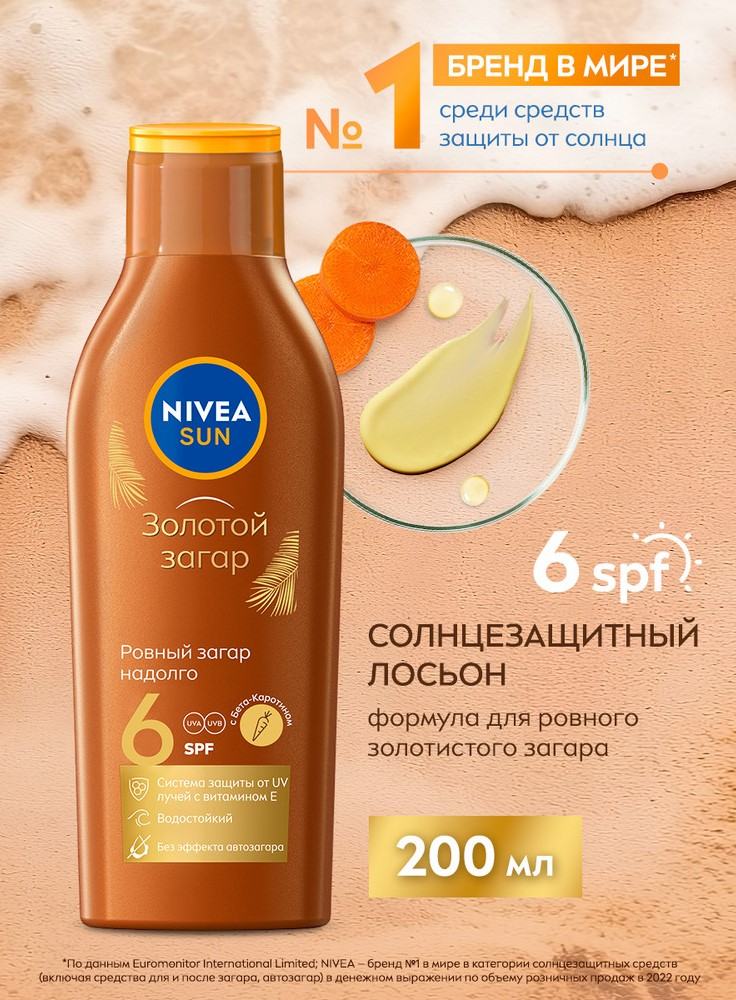Попробуйте солнцезащитный лосьон для тела Золотой загар SPF6 от Nivea Sun в объеме 200мл. Ровный загар надолго. Формула солнцезащитного лосьона Золотой загар с Бета-Каротином и Витамином Е помогает загару лучше ложиться и дольше оставаться на коже. Защищает от UVA и UVB лучей. Водостойкий. Без эффекта автозагара. Дерматологически протестировано.
