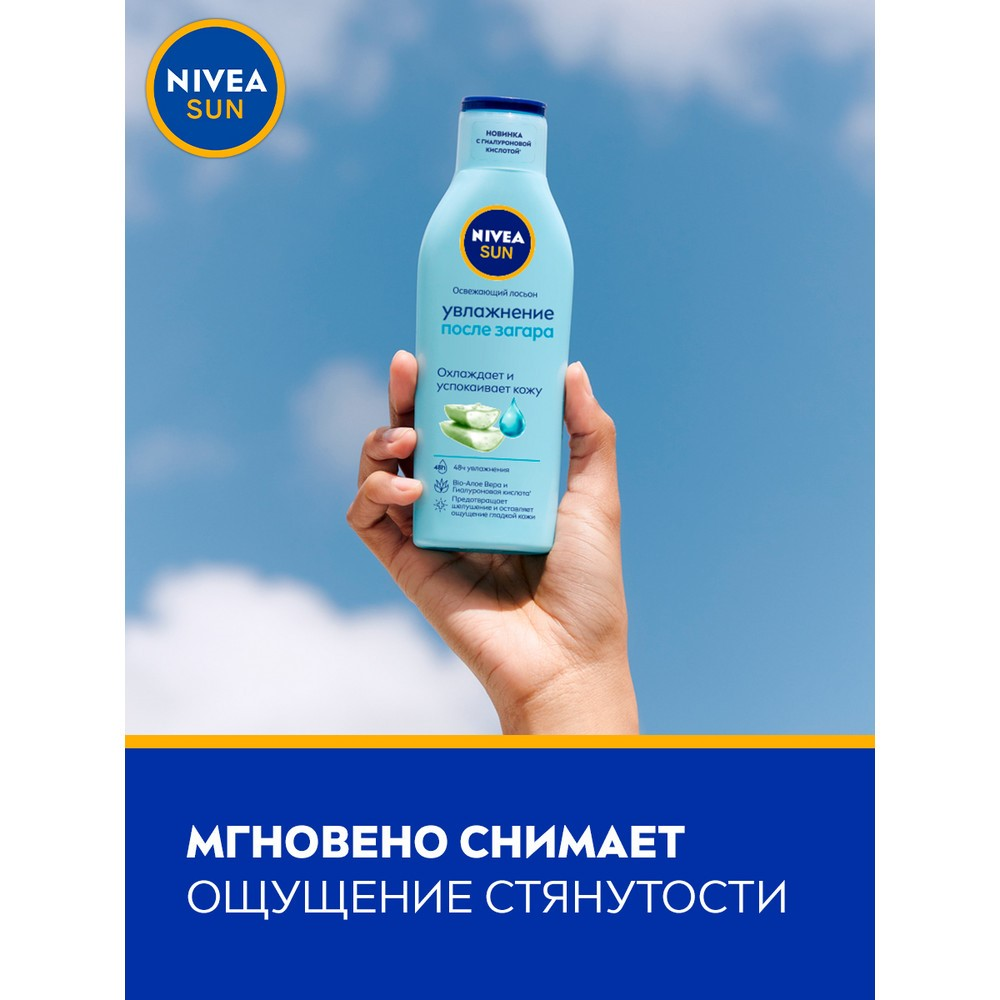Лосьон для тела Nivea Sun Увлажнение после загара с Bio-Алоэ Вера и Гиалуроновой кислотой обладает освежающим эффектом, так необходимым после загара. Успокаивает и увлажняет на 48 часов. Легкая ухаживающая и увлажняющая формула с Bio-Алоэ Вера и Гиалуроновой кислотой помогает восстановить потерю влаги кожи, предотвращает шелушение, чтобы загар оставался красивым надолго, оставляет ощущение гладкой и шелковистой кожи. Легкая формула не оставляет липкости на коже, быстро впитывается, восстанавливая вашу кожу и сохраняя загар ровным.