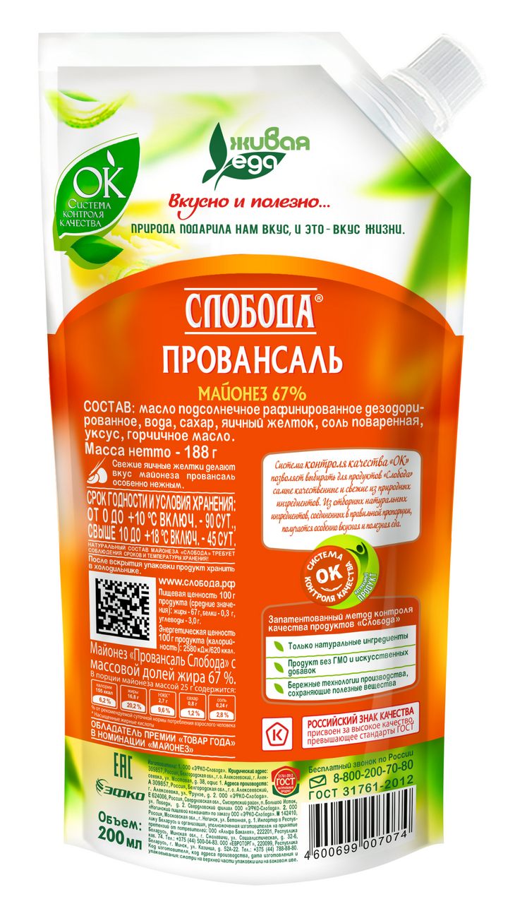 Слобода Провансаль — классический майонез, приготовленный по традиционному рецепту. В состав майонеза входят только натуральные ингредиенты: свежие яичные желтки, подсолнечное и горчичное масла, уксус и специи. Майонез Провансаль обладает насыщенным вкусом и станет отличным дополнением к вашим любимым блюдам. Его можно добавить в любимый суп, использовать как заправку для салата или в качестве маринада для рыбы и мяса. Дайте волю кулинарной фантазии и удивляйте близких оригинальными рецептами! Слобода — бренд, который знают и любят многие россияне уже на протяжении 30 лет. Все продукты Слобода отличаются настоящим вкусом и неизменным высоким качеством. Они не просто соответствуют ГОСТу, а обладают настоящей силой природы и производятся с заботой о будущем!