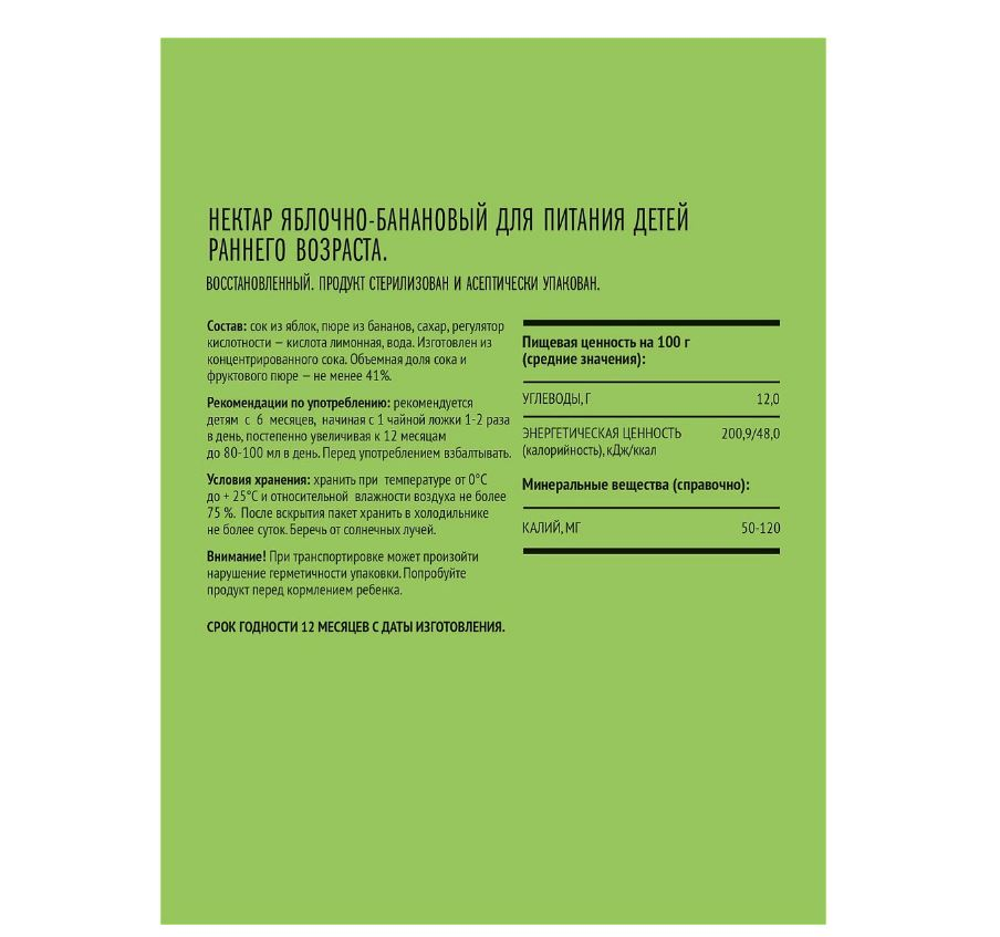 Нектар Малышам яблоко-банан, 200мл – напиток, способный быстро освежить, утолить жажду и наполнить организм энергией. Для его производства используется целый ряд компонентов. Нектар обладает богатым химическим составом – он состоит из витаминов (в частности, группы B), минералов (калий, кальций, магний, железо, йод и др.), пищевых волокон, органических кислот и легкоусвояемых углеводов. Нектар за счет своего уникального состава повышает сопротивляемость организма инфекционным и простудным заболеваниям.