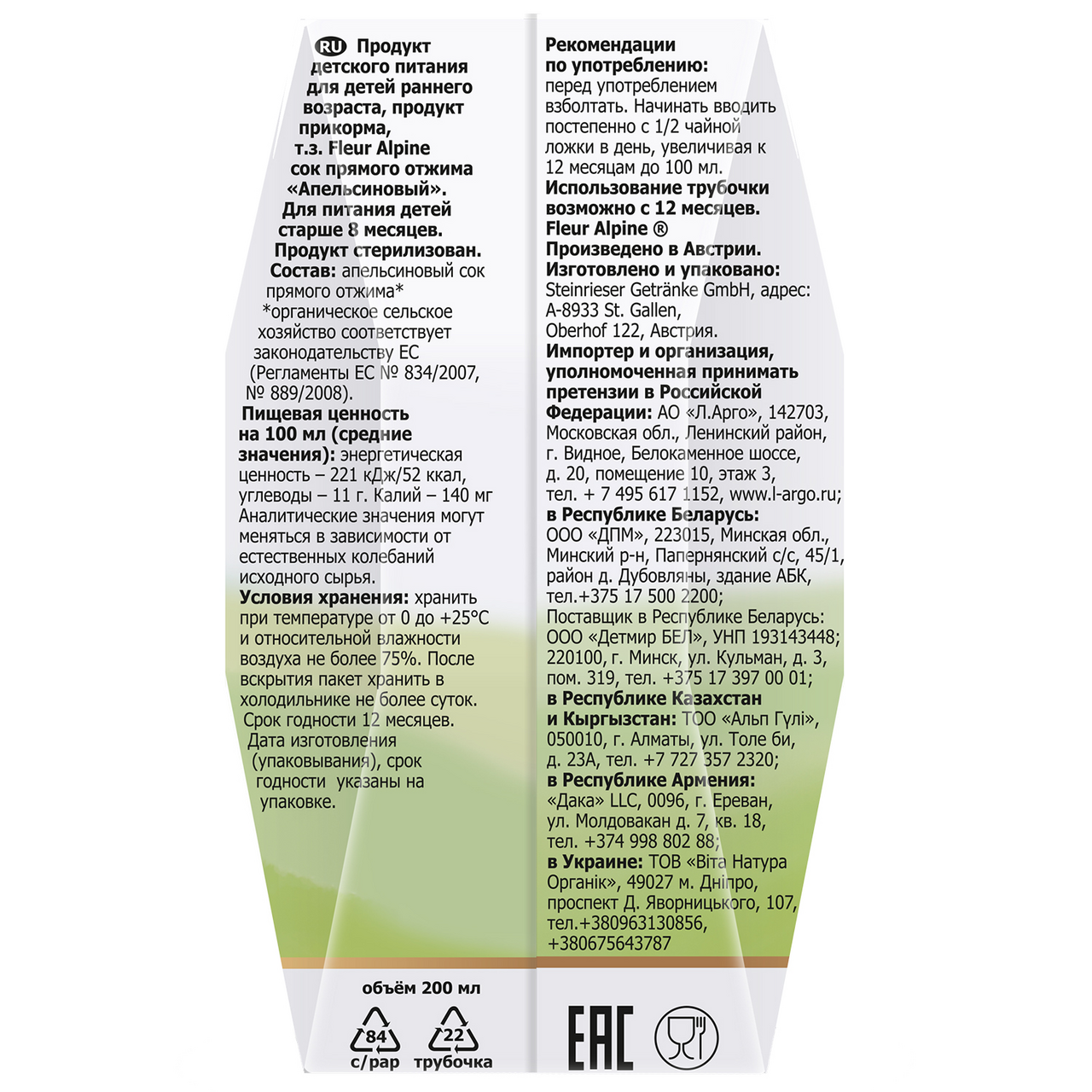 Внимательно читайте рекомендации по использованию трубочки на упаковке! Перед введением новых продуктов необходимо проконсультироваться с педиатром, который наблюдает малыша и знает все особенности его здоровья. Детский сок прямого отжима Fleur Alpine апельсиновый имеет мягкий, умеренно сладкий вкус и аромат спелого свежего апельсина, который оценят малыши и их родители. Его удобно брать с собой на прогулки и в поездки.