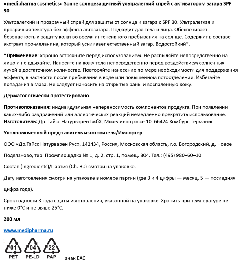 Спрей Medipharma Cosmetics Sonne с активацией загара солнцезащитный SPF30, 200мл