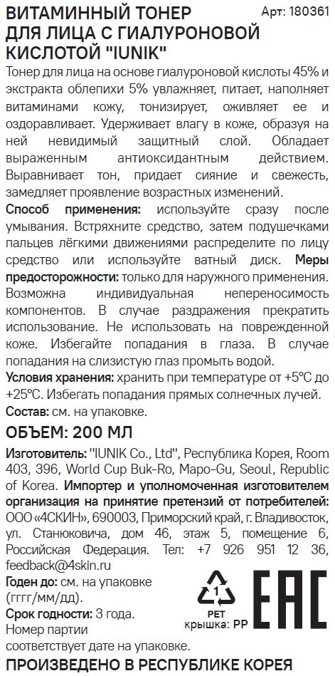 Тонер для лица Iunik витаминный с гиалуроновой кислотой, 200мл