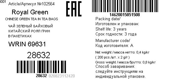 Чай зеленый Richard Royal Green пакетированный (2г x 200шт), 400г