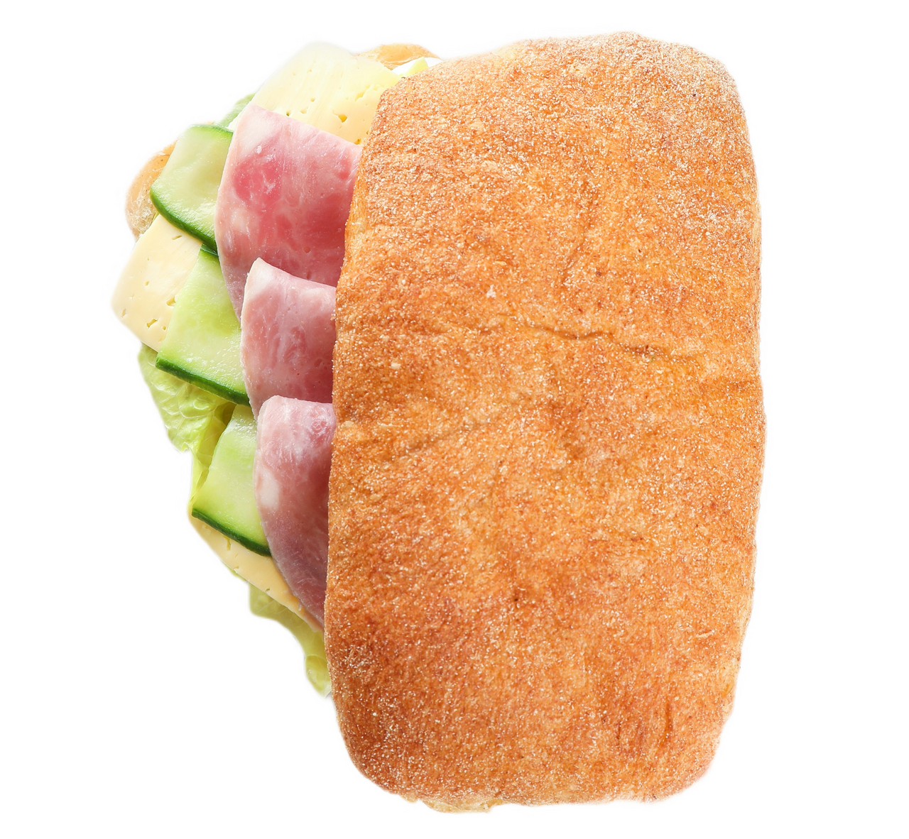 Чиабатта (мука пшеничная в/с, вода, улучшитель хлебопекарный (мука пшеничная, соль, закваска сухая ржаная, клейковина пшеничная, антиокислитель (аскорбиновая кислота), ферменты), масло подсолнечное, дрожжи), соус (майонез (вода, масло подсолнечное, сахар, продукты яичные сухие, стабилизаторы (гуаровая камедь, ксантановая камедь), соль, кислота уксусная, консервант (сорбат калия), стабилизатор (камедь ксантановая), ароматизатор горчица, краситель (каротин)), консервант (сукцинат кальция, дигидрокверцетин, эпсилон-поли-L-лизин, мальтодекстрин), гуаровая камедь), продукт ветчинный (филе куриной грудки, мясо цыпленка, вода, белковый стабилизатор, крахмал картофельный, соевый белок, комплексная пищевая добавка (стабилизатор дигидропирофосфат натрия, загуститель каррагинан из водорослей EUCHEMA, декстроза, мальтодекстрин, усилитель вкуса и аромата глутамат натрия 1-замещенный, 5-гунилат натрия 2-замещенный, 5-инозинат натрия 2-замещенный, антиокислитель изоаскорбат натрия, аскорбинова кислота, лимонная кислота, винная кислота, диоксид кремния аморфный, орто-Фосфат кальция 3-замещенный, регулятор кислотности, трифосфат натрия (5замещенный), ацетаты натрия, диацетат натрия), краситель кармины, ароматизаторы, смесь посолочно-нитритная (соль, фиксатор окраски нитрит натрия), экстракты специй и пряностей (чеснок, перец черный, перец белый, мускатный орех, кардамон), огурцы, сыр (молоко нормализованное пастеризованное, соль, уплотнитель (хлорид кальция), консервант (нитрат натрия), технологическое вспомогательное средство (молокосвертывающий препарат (ферментный раствор, соль), красители (аннато, норбиксин), регулятор кислотности (гидроксид калия), закваска мезофильных и термофильных молочнокислых микроорганизмов, консервант (натамицин)), капуста пекинская.