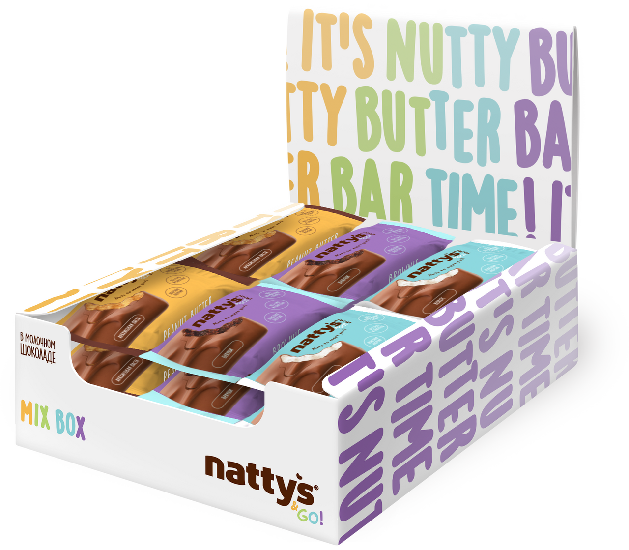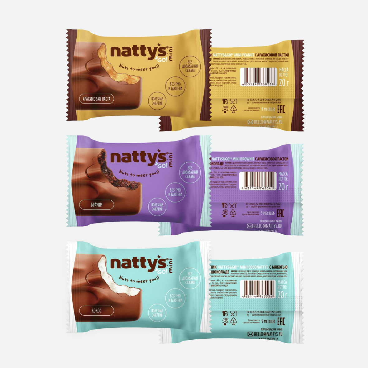 Шоколадный батончик Nattys&Go! MINI Peanut с арахисовой пастой в молочном шоколаде: арахисовая паста арахис, морская соль, молочный шоколад без сахара подсластитель мальтит, какао-масло, какао тёртое, сухое цельное молоко, эмульгатор соевый лецитин, экстракт ванили, натуральный мёд, финиковая пудра, кукурузная мука, морская соль; Шоколадный батончик Nattys&Go! MINI Brownie с арахисовой пастой и какао в молочном шоколаде: арахисовая паста арахис, морская соль, молочный шоколад без сахара подсластитель мальтит, какао-масло, какао тёртое, сухое цельное молоко, эмульгатор соевый лецитин, экстракт ванили, натуральный мёд, финиковая пудра, какао-порошок, морская соль; Шоколадный батончик Nattys&Go! MINI Coconattys с мякотью кокоса в молочном шоколаде: кокосовая паста сушёная мякоть кокоса, натуральный мёд, молочный шоколад без сахара подсластитель мальтит, какао-масло, какао тёртое, сухое цельное молоко, эмульгатор соевый лецитин, экстракт ванили, сушёная мякоть кокоса, кокосовая мука, морская соль.