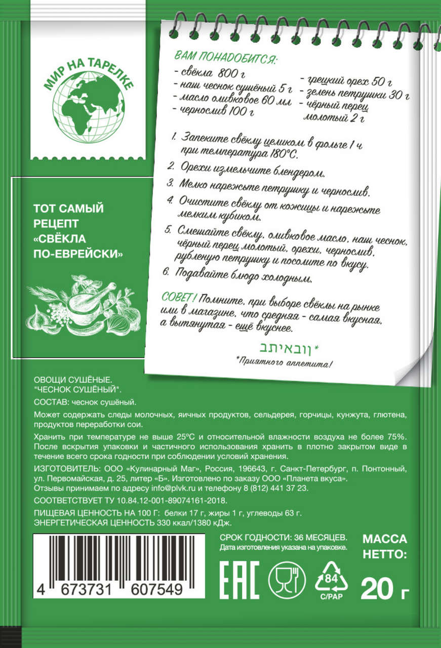 Приправа Чеснок сушеный - это натуральный продукт, который не только обогатит ваши блюда ярким ароматом и вкусом, но и принесет пользу вашему организму. Чеснок известен своими полезными свойствами, такими как улучшение пищеварения, стимуляция обменных процессов и поддержание здоровья кишечника. Эта приправа отлично сочетается с различными видами мяса - курицей, шашлыком, говядиной, а также добавляется в салаты и гарниры для придания им насыщенного вкуса. Приправа без содержания соли.