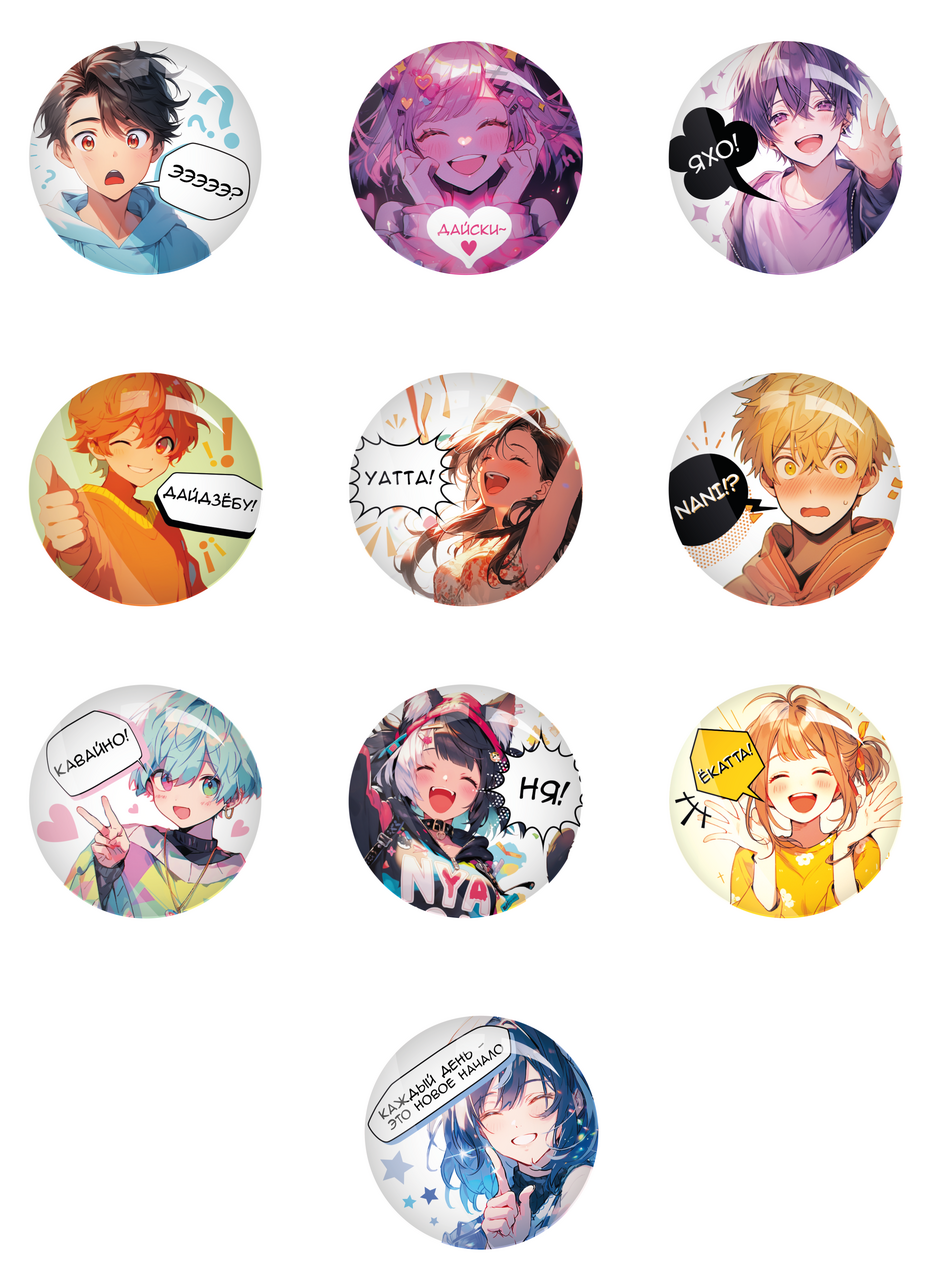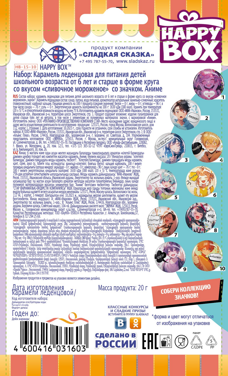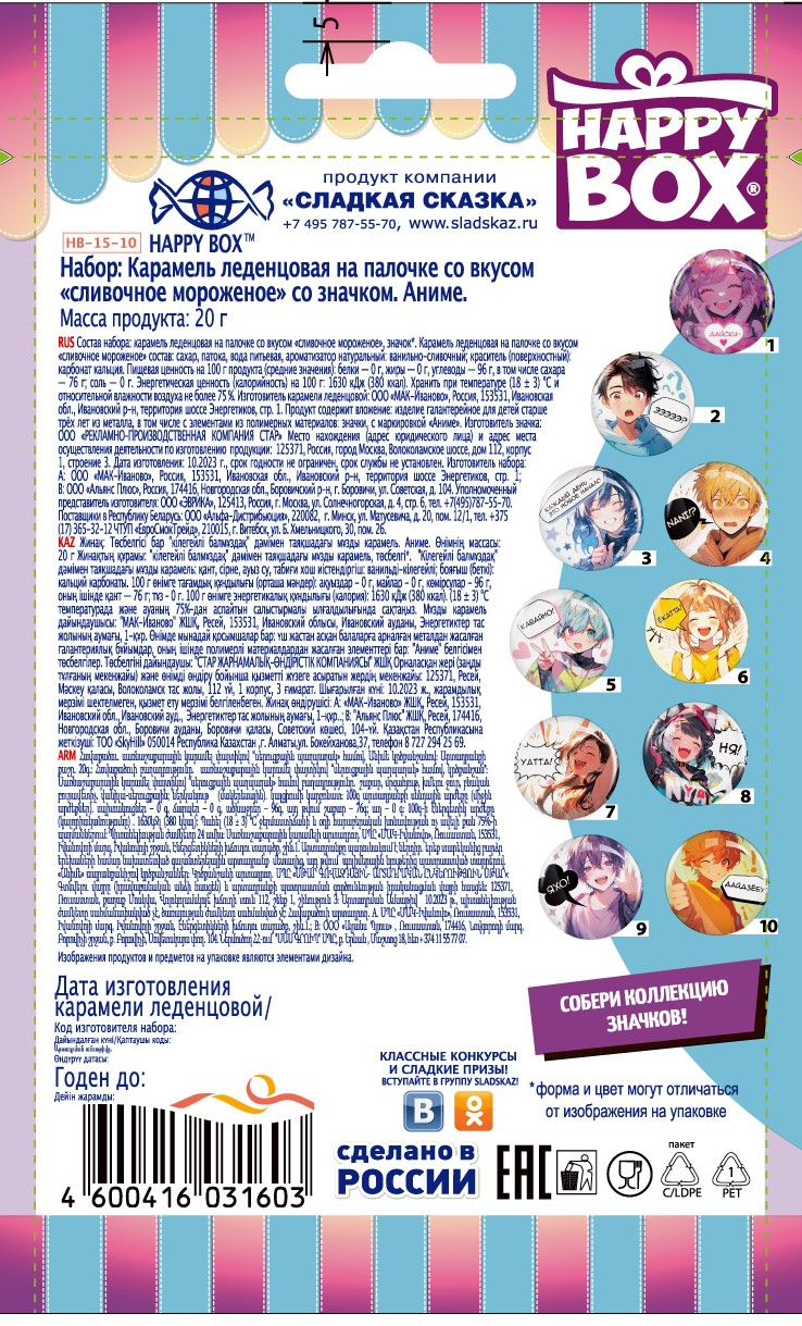 Упаковка с изображением персонажей в стиле аниме обязательно привлечет внимание потребителей на полке. Внутри яркого пакетика - два леденца на палочке со вкусом сливочного мороженого и большой коллекционный значок. Всего в коллекции 10 значков с прикольными фразами, которые часто употребляют персонажи аниме и комиксов. Состав набора: карамель леденцовая на палочке со вкусом сливочное мороженое, значок.