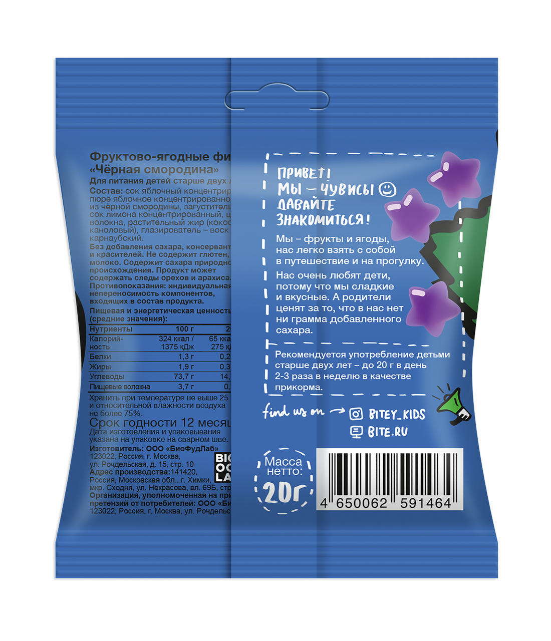 Фруктово-ягодные фигурки Bitey с черной смородиной — вкусный и полезный перекус для детей. Наш жевательный мармелад совсем не содержит добавленного сахара, консервантов, красителей и усилителей вкуса. Зато в нем много натуральных ягод и фруктов, которые поддерживают иммунитет ребенка и помогают полноценному развитию. Черная смородина — рекордсмен по содержанию витамина С. В качестве желирующего агента используется пектин – 100% натуральный, он является прекрасным источником клетчатки. А благодаря индивидуальной упаковке чувисы Bitey так удобно брать с собой на прогулку или в путешествие.