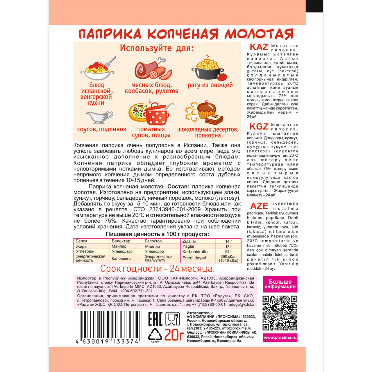Копченая паприка очень популярна в Испании. Также она успела завоевать любовь кулинаров во всем мире, ведь это изысканное дополнение к разнообразным блюдам. Копченая паприка обладает глубоким ароматом с неповторимыми нотками дымка. Ее изготавливают методом непрямого копчения дымом определенного сорта дубовых поленьев в течение 10-15 дней. Используется для испанской, венгерской кухни, мясных блюд, колбасок, рулетов, рагу из картофеля и из помидоров, соусов, заправок для салатов, томатных супов, пиццы, шоколадных десертов, попкорна.