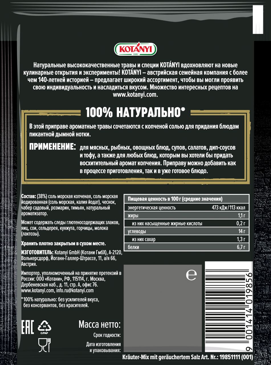 В этой приправе ароматные травы сочетаются с копченой солью для придания блюдам пикантной дымной нотки. Применение: для мясных, рыбных, овощных блюд, супов, салатов, дип-соусов и тофу, а также для любых блюд, которым вы хотели бы придать восхитительный аромат копчения. Приправу можно добавить как в процессе приготовления, так и в уже готовое блюдо. Придает блюдам пикантную дымную нотку. Она оптимально подходит для мясных, рыбных, овощных блюд, супов, салатов, дип-соусов и тофу, а также для любых блюд, которым необходимо придать восхитительный аромат копчения.